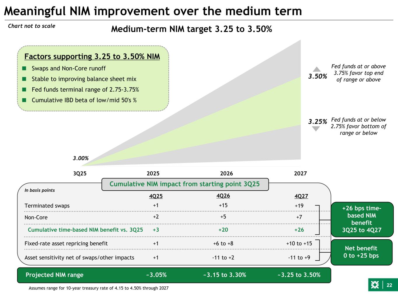 22 3Q25 2025 2026 2027 Meaningful NIM improvement over the medium term Medium-term NIM target 3.25 to 3.50% Terminated swaps Non-Core Asset sensitivity net of swaps/other impacts   Projected NIM range Fixed-rate asset repricing benefit Cumulative time-based NIM benefit vs. 3Q25 4Q26 4Q27 In basis points +15 +5 +20 +19 +7 +26 +10 to +15 -11 to +9 ~3.25 to 3.50%  Chart not to scale 3.00% Net benefit  0 to +25 bps 3.25% 3.50% Fed funds at or above  3.75% favor top end  of range or above Fed funds at or below  2.75% favor bottom of  range or below Factors supporting 3.25 to 3.50% NIM ■ Swaps and Non-Core runoff ■ Stable to improving balance sheet mix ■ Fed funds terminal range of 2.75-3.75% ■ Cumulative IBD beta of low/mid 50's % +26 bps time- based NIM  benefit  3Q25 to 4Q27  4Q25 +1 +2 +3 ~3.05% ~3.15 to 3.30% Assumes range for 10-year treasury rate of 4.15 to 4.50% through 2027 +6 to +8+1 +1 -11 to +2 Cumulative NIM impact from starting point 3Q25