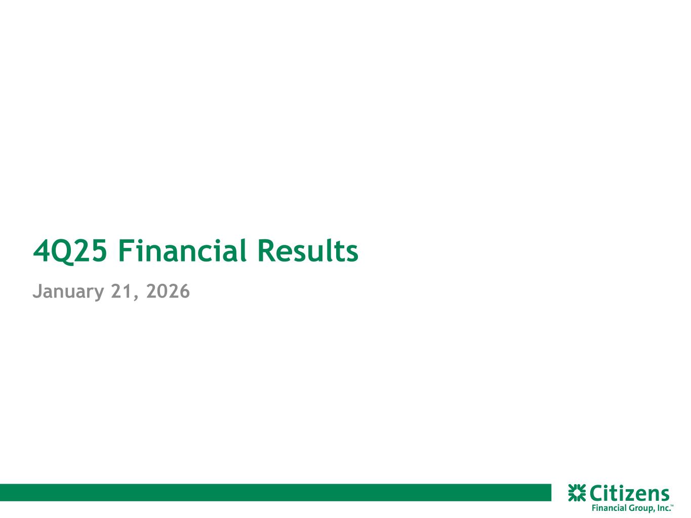 42 Notes continued Notes on slide 18 - Best-positioned Commercial Bank 1) Reflects business unit results for Commercial Payments activities, including net interest income and fees. 2) Represents loan syndications; source: LSEG LPC Notes on slide 19 - Private Bank buildout - financial update 1) Represents Return on Regulatory Capital. See page 53 for details. 2) Total Client Assets (TCA) include Assets Under Management (AUM) and Transactional Assets. AUM represent assets for which Citizens’ investment advisory affiliates provide continuous and regular supervisory or management services. Transaction assets represent assets for which Citizens' Wealth Management affiliates provide execution, custody, record keeping, reporting and other administrative services. 3) Assets Under Management referenced represents AUM of Citizens Private Wealth & Citizens Wealth Management, our Private Bank advisory affiliates. 4) Transactional assets referenced represents assets of Citizens Wealth Management, our Private Bank brokerage affiliate. Notes on slide 20 - Private Bank - building a sustainable, growing high-quality franchise 1) Represents Return on Regulatory Capital. See page 53 for details. 2) Total Client Assets (TCA) include Assets Under Management (AUM) and Transactional Assets. AUM represents assets for which Citizens’ investment advisory affiliates provide continuous and regular supervisory or management services. Transaction assets represent assets for which Citizens' Wealth Management affiliates provide execution, custody, record keeping, reporting and other administrative services. 3) Assets Under Management referenced represent AUM of Citizens Private Wealth & Citizens Wealth Management, our Private Bank advisory affiliates. 4) Transactional assets referenced represent assets of Citizens Wealth Management, our Private Bank brokerage affiliate. Notes on slide 23 - FY2026 Outlook vs. 2025 1) See general note d). Notes on slide 25 - 1Q26 outlook vs. 4Q25 1) See general note d). Notes on slide 26 - Medium-term financial targets 1) See note on non-GAAP financial measures. Notes on slide 28 - Medium-term ROTCE outlook 1) See note on non-GAAP financial measures. Notes on slide 29 - Citizens is an attractive investment opportunity 1) Represents Return on Regulatory Capital. See page 53 for details. Notes on slide 31 - FY2025 Scorecard 1) See note on non-GAAP financial measures. 2) See general note d). Notes on slide 32 - 4Q25 Private Bank financial performance 1) Total Client Assets (TCA) include Assets Under Management (AUM) and Transactional Assets. AUM represents assets for which Citizens’ investment advisory affiliates provide continuous and regular supervisory or management services. Transaction assets represent assets for which Citizens' Wealth Management affiliates provide execution, custody, record keeping, reporting and other administrative services. 2) Assets Under Management referenced represent AUM of Citizens Private Wealth & Citizens Wealth Management, our Private Bank advisory affiliates. 3) Transactional assets referenced represent assets of Citizens Wealth Management, our Private Bank brokerage affiliate. 4) Represents Return on Regulatory Capital. See page 53 for details. Notes on slide 33 - Interest rate risk management 1) Represents fair value balances. Notes on slide 34 - Loan growth in 2026 to reflect less run-off from Non-Core and Commercial BSO 1) See general note c). Notes on slide 35 - $73.8B Commercial credit portfolio 1) Includes deferred fees and costs. 2) Credit tenant lease includes loans to nationally recognized tenants with high credit ratings and life sciences includes loans to provide lab and office space for tenants involved in the study and development of scientific discoveries. 3) Reflects period end balances.