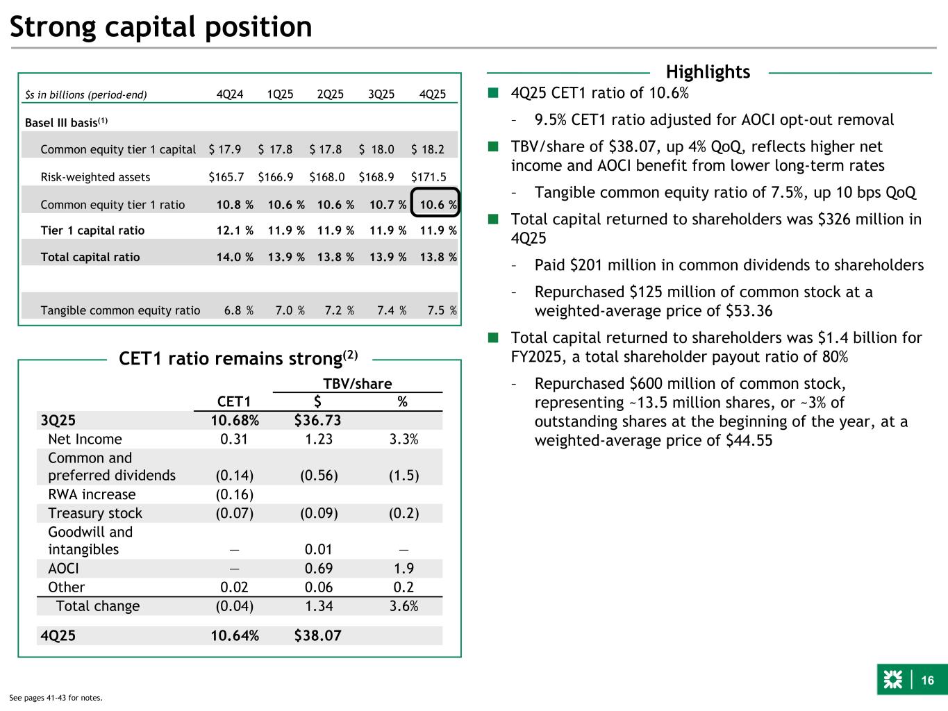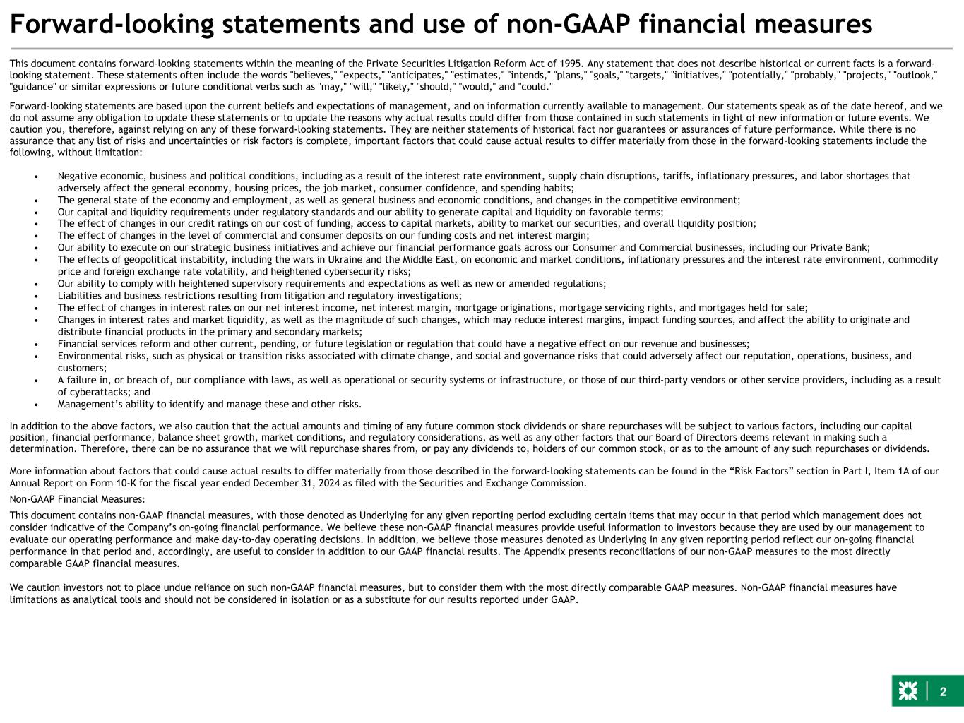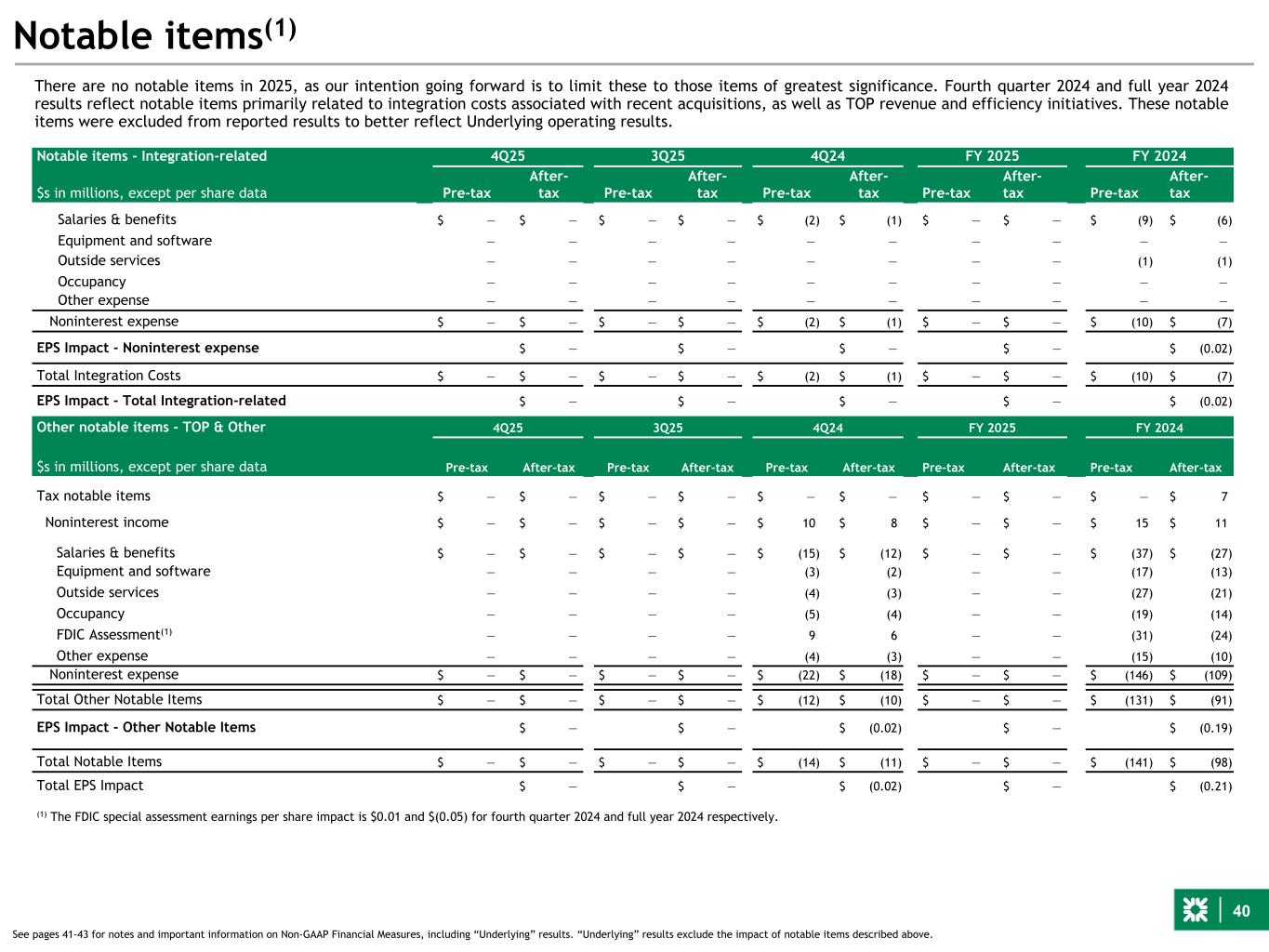 40 Notable items(1) There are no notable items in 2025, as our intention going forward is to limit these to those items of greatest significance. Fourth quarter 2024 and full year 2024 results reflect notable items primarily related to integration costs associated with recent acquisitions, as well as TOP revenue and efficiency initiatives. These notable items were excluded from reported results to better reflect Underlying operating results. See pages 41-43 for notes and important information on Non-GAAP Financial Measures, including “Underlying” results. “Underlying” results exclude the impact of notable items described above. Notable items - Integration-related 4Q25 3Q25 4Q24 FY 2025 FY 2024 $s in millions, except per share data Pre-tax After- tax Pre-tax After- tax Pre-tax After- tax Pre-tax After- tax Pre-tax After- tax Salaries & benefits $ — $ — $ — $ — $ (2) $ (1) $ — $ — $ (9) $ (6) Equipment and software — — — — — — — — — — Outside services — — — — — — — — (1) (1) Occupancy — — — — — — — — — — Other expense — — — — — — — — — — Noninterest expense $ — $ — $ — $ — $ (2) $ (1) $ — $ — $ (10) $ (7) EPS Impact - Noninterest expense $ — $ — $ — $ — $ (0.02) Total Integration Costs $ — $ — $ — $ — $ (2) $ (1) $ — $ — $ (10) $ (7) EPS Impact - Total Integration-related $ — $ — $ — $ — $ (0.02) Other notable items - TOP & Other 4Q25 3Q25 4Q24 FY 2025 FY 2024 $s in millions, except per share data Pre-tax After-tax Pre-tax After-tax Pre-tax After-tax Pre-tax After-tax Pre-tax After-tax Tax notable items $ — $ — $ — $ — $ — $ — $ — $ — $ — $ 7 Noninterest income $ — $ — $ — $ — $ 10 $ 8 $ — $ — $ 15 $ 11 Salaries & benefits $ — $ — $ — $ — $ (15) $ (12) $ — $ — $ (37) $ (27) Equipment and software — — — — (3) (2) — — (17) (13) Outside services — — — — (4) (3) — — (27) (21) Occupancy — — — — (5) (4) — — (19) (14) FDIC Assessment(1) — — — — 9 6 — — (31) (24) Other expense — — — — (4) (3) — — (15) (10) Noninterest expense $ — $ — $ — $ — $ (22) $ (18) $ — $ — $ (146) $ (109) Total Other Notable Items $ — $ — $ — $ — $ (12) $ (10) $ — $ — $ (131) $ (91) EPS Impact - Other Notable Items $ — $ — $ (0.02) $ — $ (0.19) Total Notable Items $ — $ — $ — $ — $ (14) $ (11) $ — $ — $ (141) $ (98) Total EPS Impact $ — $ — $ (0.02) $ — $ (0.21) (1) The FDIC special assessment earnings per share impact is $0.01 and $(0.05) for fourth quarter 2024 and full year 2024 respectively.