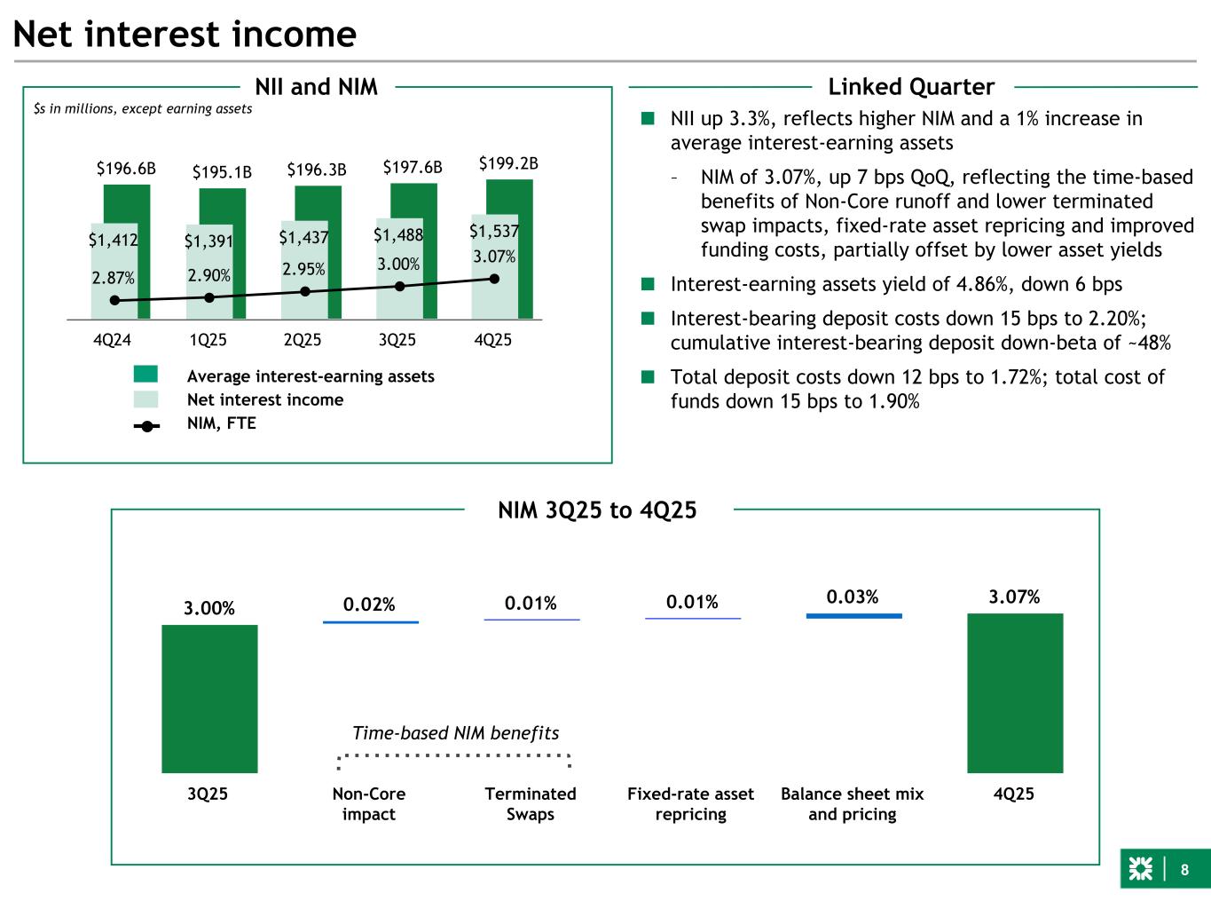7 ■ Maintained a strong capital position while continuing to repurchase shares – CET1 ratio of 10.6%(2); 9.5% adjusted for AOCI opt-out removal – Share repurchases of $600 million in FY2025, with total shareholder payout ratio of 80% ■ Strong liquidity profile; spot LDR of 77.8%; average deposits up ~$4 billion, or 2% QoQ driven by growth in Private Bank and Commercial – Private Bank spot deposits of $14.5 billion – Interest-bearing deposit costs down 15 bps QoQ ■ Loans up 1% QoQ with growth led by Private Bank and Commercial, as Non-Core runoff and balance sheet optimization impacts lessen ■ Continuing favorable credit trends with net charge-offs of 43 bps, down 3 bps QoQ ■ Strong ACL coverage of 1.53%, down slightly QoQ reflecting improved loan mix ■ 4Q25 EPS of $1.13, up 36% YoY reflects strong PPNR growth ■ ROTCE of 12.2%, up 43 bps QoQ, and 152 bps YoY on an Underlying basis ■ PPNR of $814 million, up 4% QoQ; up 19% YoY on an Underlying basis – NII up 3.3% QoQ as NIM continues to expand, up 7 bps to 3.07% – Strong fee performance led by Wealth, up 5% QoQ and 31% YoY; Capital Markets up 16% YoY – Positive operating leverage of 1.3% QoQ, and 5.2% YoY on an Underlying basis; efficiency ratio improved 79 bps to 62.2% ■ 2025 EPS of $3.86, up 19% on an Underlying basis; Private Bank $0.28, or ~7% earnings contribution – Wealth fees up 22% and Capital Markets up 9% driving strong fee performance, up 11% – Positive operating leverage of 1.2% on an Underlying basis Strong FY2025 and 4Q25 results Maintaining a strong capital and liquidity position Positive trends in loans and credit FY2025 and 4Q25 Overview(1) ■ Private Bank exceeded earnings and balance sheet targets for 2025, with strong momentum continuing into 2026, adding wealth teams and opening new PBOs; achieved ~25% ROE(3) for 2025 and expect to maintain 20-25% over the medium term ■ Good visibility and confidence in driving NIM to 3.30-3.50% and NII higher over the medium term ■ Strong execution of strategic initiatives (Private Bank, NYC Metro, Private Capital, Payments) continues ■ TOP 10 achieved ~$100 million pre-tax run-rate benefit as of year-end 2025; launched Reimagine the Bank (multi-year transformational program) that targets ~$450 million of pre-tax run-rate benefit by year-end 2028 Well positioned to achieve 16-18% ROTCE over the medium term See pages 41-43 for notes and important information on Non-GAAP Financial Measures, including “Underlying” results. “Underlying” results exclude the impact of notable items described on page 40. PPNR performance 4Q25 QoQ YoY(1) NII $ 1,537 3.3% 8.9% Fees 620 (1.6) 9.9 Expenses 1,343 0.6 3.9 PPNR $ 814 4.0% 19.0%