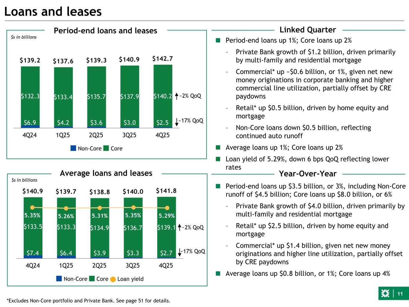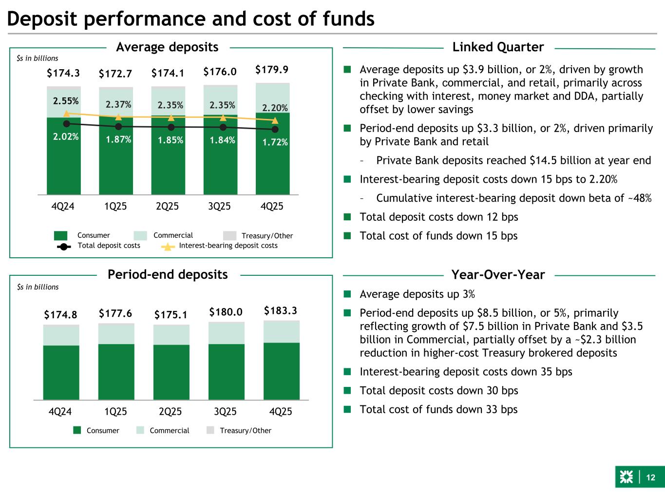 11 $140.9 $139.7 $138.8 $140.0 $141.8 $7.4 $6.4 $3.9 $3.3 $2.7 $133.5 $133.3 $134.9 $136.7 $139.1 Non-Core Core Loan yield 4Q24 1Q25 2Q25 3Q25 4Q25 ~17% QoQ ■ Period-end loans up 1%; Core loans up 2% – Private Bank growth of $1.2 billion, driven primarily by multi-family and residential mortgage – Commercial* up ~$0.6 billion, or 1%, given net new money originations in corporate banking and higher commercial line utilization, partially offset by CRE paydowns – Retail* up $0.5 billion, driven by home equity and mortgage – Non-Core loans down $0.5 billion, reflecting continued auto runoff ■ Average loans up 1%; Core loans up 2% ■ Loan yield of 5.29%, down 6 bps QoQ reflecting lower rates Loans and leases $s in billions Average loans and leases $139.2 $137.6 $139.3 $140.9 $142.7 $6.9 $4.2 $3.6 $3.0 $2.5 $132.3 $133.4 $135.7 $137.9 $140.2 Non-Core Core 4Q24 1Q25 2Q25 3Q25 4Q25 $s in billions Period-end loans and leases 5.35% 5.26% 5.31% 5.35% 5.29% Linked Quarter Year-Over-Year ~17% QoQ ~2% QoQ ~2% QoQ *Excludes Non-Core portfolio and Private Bank. See page 51 for details. ■ Period-end loans up $3.5 billion, or 3%, including Non-Core runoff of $4.5 billion; Core loans up $8.0 billion, or 6% – Private Bank growth of $4.0 billion, driven primarily by multi-family and residential mortgage – Retail* up $2.5 billion, driven by home equity and mortgage – Commercial* up $1.4 billion, given net new money originations and higher line utilization, partially offset by CRE paydowns ■ Average loans up $0.8 billion, or 1%; Core loans up 4%