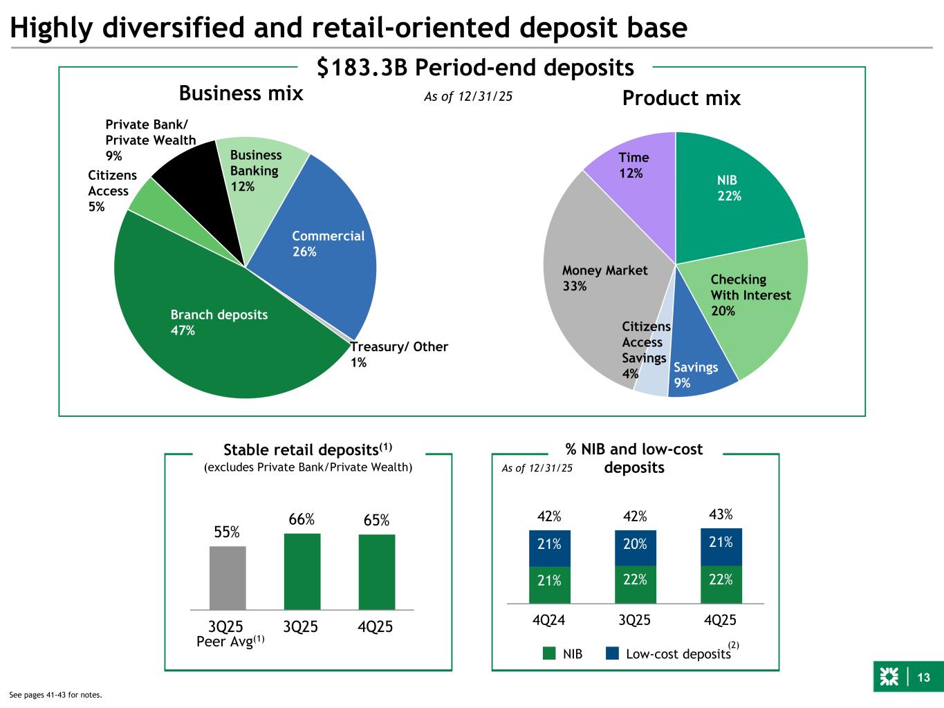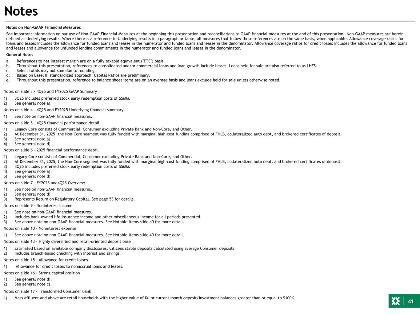 41 Notes on Non-GAAP Financial Measures See important information on our use of Non-GAAP Financial Measures at the beginning this presentation and reconciliations to GAAP financial measures at the end of this presentation. Non-GAAP measures are herein defined as Underlying results. Where there is a reference to Underlying results in a paragraph or table, all measures that follow these references are on the same basis, when applicable. Allowance coverage ratios for loans and leases includes the allowance for funded loans and leases in the numerator and funded loans and leases in the denominator. Allowance coverage ratios for credit losses includes the allowance for funded loans and leases and allowance for unfunded lending commitments in the numerator and funded loans and leases in the denominator. General Notes a. References to net interest margin are on a fully taxable equivalent ("FTE") basis. b. Throughout this presentation, references to consolidated and/or commercial loans and loan growth include leases. Loans held for sale are also referred to as LHFS. c. Select totals may not sum due to rounding. d. Based on Basel III standardized approach. Capital Ratios are preliminary. e. Throughout this presentation, reference to balance sheet items are on an average basis and loans exclude held for sale unless otherwise noted. Notes Notes on slide 3 - 4Q25 and FY2025 GAAP Summary 1) 3Q25 includes preferred stock early redemption costs of $5MM. 2) See general note a). Notes on slide 4 - 4Q25 and FY2025 Underlying financial summary 1) See note on non-GAAP financial measures. Notes on slide 5 - 4Q25 financial performance detail 1) Legacy Core consists of Commercial, Consumer excluding Private Bank and Non-Core, and Other. 2) At December 31, 2025, the Non-Core segment was fully funded with marginal high-cost funding comprised of FHLB, collateralized auto debt, and brokered certificates of deposit. 3) See general note a). 4) See general note d). Notes on slide 6 - 2025 financial performance detail 1) Legacy Core consists of Commercial, Consumer excluding Private Bank and Non-Core, and Other. 2) At December 31, 2025, the Non-Core segment was fully funded with marginal high-cost funding comprised of FHLB, collateralized auto debt, and brokered certificates of deposit. 3) 3Q25 includes preferred stock early redemption costs of $5MM. 4) See general note a). 5) See general note d). Notes on slide 7 - FY2025 and4Q25 Overview 1) See note on non-GAAP financial measures. 2) See general note d). 3) Represents Return on Regulatory Capital. See page 53 for details. Notes on slide 9 - Noninterest income 1) See note on non-GAAP financial measures. 2) Includes bank-owned life insurance income and other miscellaneous income for all periods presented. 3) See above note on non-GAAP financial measures. See Notable Items slide 40 for more detail. Notes on slide 10 - Noninterest expense 1) See above note on non-GAAP financial measures. See Notable Items slide 40 for more detail. Notes on slide 13 - Highly diversified and retail-oriented deposit base 1) Estimated based on available company disclosures; Citizens stable deposits calculated using average Consumer deposits. 2) Includes branch-based checking with interest and savings. Notes on slide 15 - Allowance for credit losses 1) Allowance for credit losses to nonaccrual loans and leases. Notes on slide 16 - Strong capital position 1) See general note d). 2) See general note c). Notes on slide 17 - Transformed Consumer Bank 1) Mass affluent and above are retail households with the higher value of IXI or current month deposit/investment balances greater than or equal to $100K. For slide 18 - *AUM as of 9/30/2025. As Assets Under Management referenced above represents aggregated AUM [of the Private Bank] across our investment advisory affiliates.