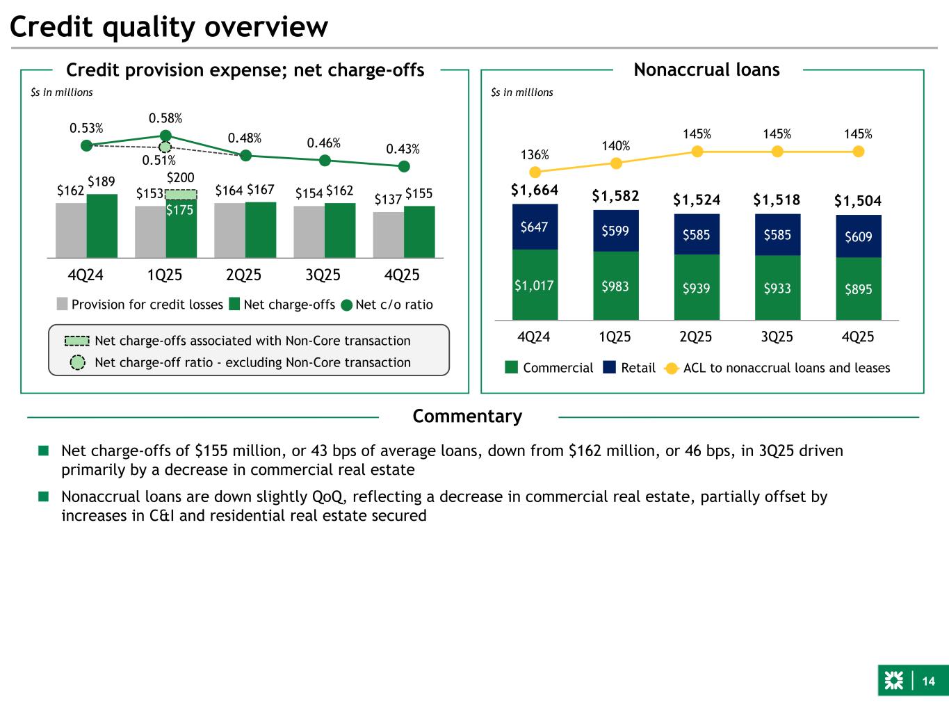 12 $174.3 $172.7 $174.1 $176.0 $179.9 4Q24 1Q25 2Q25 3Q25 4Q25 Deposit performance and cost of funds $s in billions Average deposits 2.02% 1.87% 1.85% 1.84% 1.72% 2.55% 2.37% 2.35% 2.35% 2.20% Total deposit costs Interest-bearing deposit costs CommercialConsumer Treasury/Other Year-Over-YearPeriod-end deposits Linked Quarter ■ Average deposits up $3.9 billion, or 2%, driven by growth in Private Bank, commercial, and retail, primarily across checking with interest, money market and DDA, partially offset by lower savings ■ Period-end deposits up $3.3 billion, or 2%, driven primarily by Private Bank and retail – Private Bank deposits reached $14.5 billion at year end ■ Interest-bearing deposit costs down 15 bps to 2.20% – Cumulative interest-bearing deposit down beta of ~48% ■ Total deposit costs down 12 bps ■ Total cost of funds down 15 bps $s in billions ■ Average deposits up 3% ■ Period-end deposits up $8.5 billion, or 5%, primarily reflecting growth of $7.5 billion in Private Bank and $3.5 billion in Commercial, partially offset by a ~$2.3 billion reduction in higher-cost Treasury brokered deposits ■ Interest-bearing deposit costs down 35 bps ■ Total deposit costs down 30 bps ■ Total cost of funds down 33 bps $174.8 $177.6 $175.1 $180.0 $183.3 Consumer Commercial Treasury/Other 4Q24 1Q25 2Q25 3Q25 4Q25