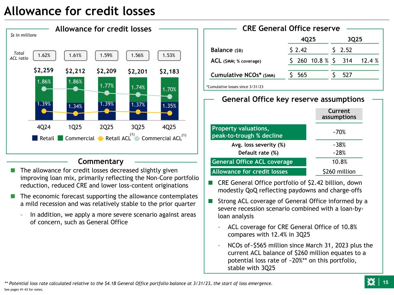 15 Allowance for credit losses Current assumptions Property valuations, peak-to-trough % decline ~70% Avg. loss severity (%) ~38% Default rate (%) ~28% General Office ACL coverage 10.8% Allowance for credit losses $260 million General Office key reserve assumptions ■ CRE General Office portfolio of $2.42 billion, down modestly QoQ reflecting paydowns and charge-offs ■ Strong ACL coverage of General Office informed by a severe recession scenario combined with a loan-by- loan analysis – ACL coverage for CRE General Office of 10.8% compares with 12.4% in 3Q25 – NCOs of~$565 million since March 31, 2023 plus the current ACL balance of $260 million equates to a potential loss rate of ~20%** on this portfolio, stable with 3Q25 4Q25 3Q25 Balance ($B) $ 2.42 $ 2.52 ACL ($MM; % coverage) $ 260 10.8 % $ 314 12.4 % Cumulative NCOs* ($MM) $ 565 $ 527 CRE General Office reserve *Cumulative losses since 3/31/23 $2,259 $2,212 $2,209 $2,201 $2,183 1.39% 1.34% 1.39% 1.37% 1.35% 1.86% 1.86% 1.77% 1.74% 1.70% Retail Commercial Retail ACL Commercial ACL 4Q24 1Q25 2Q25 3Q25 4Q25 $s in millions Allowance for credit losses (1) ** Potential loss rate calculated relative to the $4.1B General Office portfolio balance at 3/31/23, the start of loss emergence. ■ The allowance for credit losses decreased slightly given improving loan mix, primarily reflecting the Non-Core portfolio reduction, reduced CRE and lower loss-content originations ■ The economic forecast supporting the allowance contemplates a mild recession and was relatively stable to the prior quarter – In addition, we apply a more severe scenario against areas of concern, such as General Office Commentary 1.62% 1.61% 1.59% 1.56% 1.53%Total ACL ratio See pages 41-43 for notes. (1)