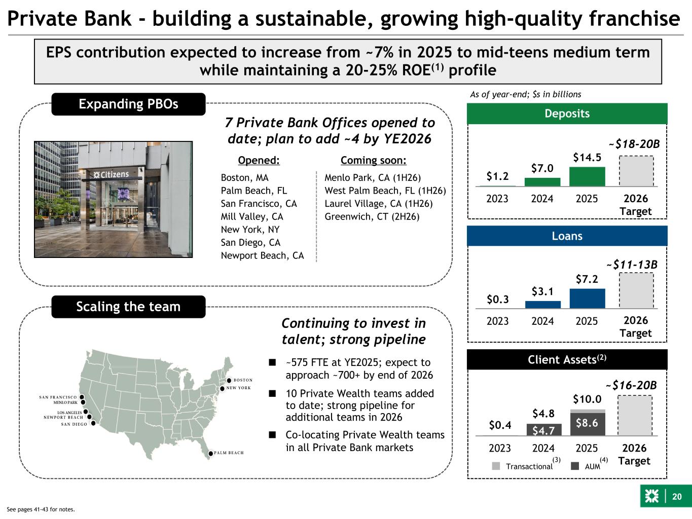 19 Deposits $2.6 $5.3 $6.3$3.1 $5.9 $7.2 Avg Spot 4Q24 3Q25 4Q25 $6.5 $10.7 $13.1$7.0 $12.5 $14.5 Avg Spot 4Q24 3Q25 4Q25 $s in billions Loans Private Bank buildout - financial update ■ ~7% earnings contribution to total CFG in 2025, ahead of original expectation of 5%+ ■ Performed very well against year-end targets, exceeding $12 billion deposits and $7 billion loans; Client Assets of $10 billion, modestly below target; strong momentum continuing into 2026 ■ Achieved ROE of ~25%(1) for 2025 and expect to maintain 20-25% target over the medium term Delivering financial impact Performed well against 2025 targets with accelerating momentum $s in billions $4.8 $9.0 $10.0 $4.7 $7.6 $8.6 AUM Transactional assets 4Q24 3Q25 4Q25 As of period end; $s in billions Client Assets ■ Avg. portfolio yield ~6.3%; ~4.1% spread over deposit cost ■ 4Q25 loan growth driven by commercial, primarily multi- family and higher C&I line utilization, as well as growth in residential mortgage ■ 10 advisor teams added since launch across key markets – New York, San Francisco, Boston, South Florida, Southern California ■ Total Client Assets of $10.0 billion at 4Q25 includes transactional assets of $1.4 billion ■ ~36% DDA; ~2.15% total deposit cost, down ~17 bps QoQ ■ Continued strong client growth in Q4 with ~$2.5 billion increase in average deposits; $2.0 billion spot growth (3) (2) (4) See pages 41-43 for notes and important information on Non-GAAP Financial Measures, including “Underlying” results. “Underlying” results exclude the impact of notable items described on page 40.
