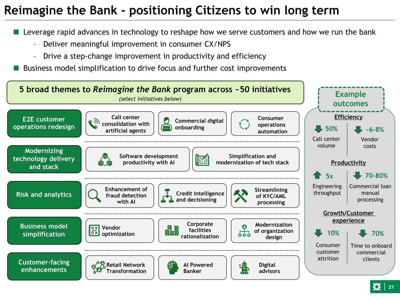 21 Call center consolidation with artificial agents ■ Leverage rapid advances in technology to reshape how we serve customers and how we run the bank – Deliver meaningful improvement in consumer CX/NPS – Drive a step-change improvement in productivity and efficiency ■ Business model simplification to drive focus and further cost improvements Reimagine the Bank - positioning Citizens to win long term 5 broad themes to Reimagine the Bank program across ~50 initiatives Modernizing technology delivery and stack Risk and analytics E2E customer operations redesign Customer-facing enhancements Business model simplification Call center volume Commercial loan manual processing Consumer customer attrition Vendor costs Engineering throughput 5x ~6-8% 10% 70-80% 50% (select initiatives below) Example outcomes Commercial digital onboarding Software development productivity with AI Simplification and modernization of tech stack Enhancement of fraud detection with AI Credit intelligence and decisioning Streamlining of KYC/AML processing AI Powered Banker Digital advisors Retail Network Transformation Vendor optimization Corporate facilities rationalization Consumer operations automation Efficiency Modernization of organization design Productivity Growth/Customer experience Time to onboard commercial clients 70%