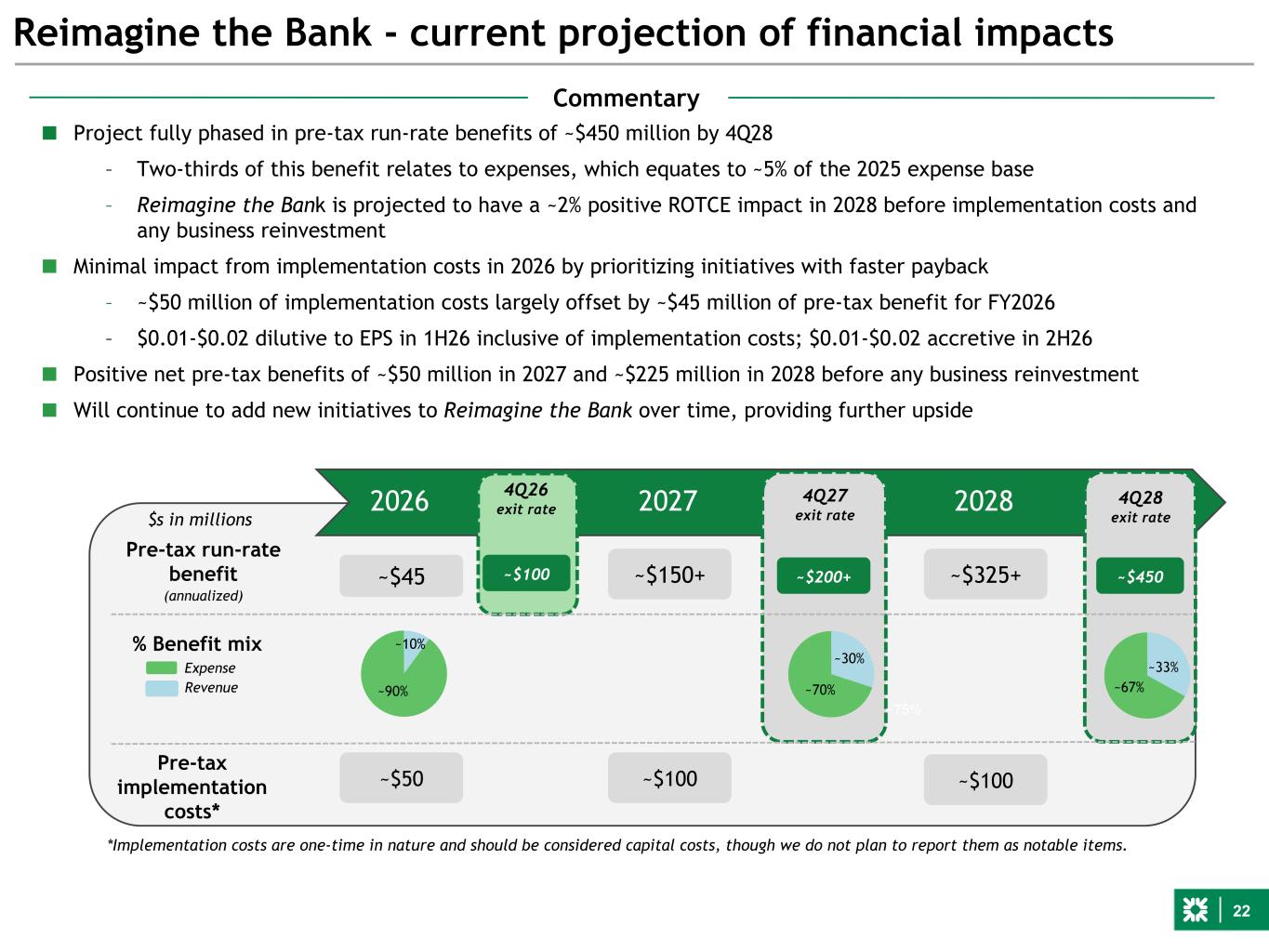 22 Pre-tax run-rate benefit (annualized) Reimagine the Bank - current projection of financial impacts 2026 $s in millions ~$45 ~$450 % Benefit mix Expense Revenue ~75% ~67% Pre-tax implementation costs* ~$50 *Implementation costs are one-time in nature and should be considered capital costs, though we do not plan to report them as notable items. ~$200+ ~70%~90% ~10% ~30% ~33% 4Q26 exit rate ~$100 ■ Project fully phased in pre-tax run-rate benefits of ~$450 million by 4Q28 – Two-thirds of this benefit relates to expenses, which equates to ~5% of the 2025 expense base – Reimagine the Bank is projected to have a ~2% positive ROTCE impact in 2028 before implementation costs and any business reinvestment ■ Minimal impact from implementation costs in 2026 by prioritizing initiatives with faster payback – ~$50 million of implementation costs largely offset by ~$45 million of pre-tax benefit for FY2026 – $0.01-$0.02 dilutive to EPS in 1H26 inclusive of implementation costs; $0.01-$0.02 accretive in 2H26 ■ Positive net pre-tax benefits of ~$50 million in 2027 and ~$225 million in 2028 before any business reinvestment ■ Will continue to add new initiatives to Reimagine the Bank over time, providing further upside Commentary 4Q27 exit rate 4Q28 exit rate ~$100 2027 2028 ~$100 ~$150+ ~$325+