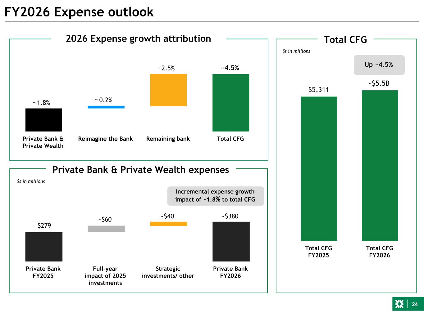 24 1.8% 0.2% 2.5% 4.5% Private Bank & Private Wealth Reimagine the Bank Remaining bank Total CFG Private Bank FY2025 Full-year impact of 2025 investments Strategic investments/ other Private Bank FY2026 $s in millions FY2026 Expense outlook Incremental expense growth impact of ~1.8% to total CFG $5,311 $5,543 Total CFG FY2025 Total CFG FY2026 Total CFG Up ~4.5% ~$60 ~$380 Private Bank & Private Wealth expenses 2026 Expense growth attribution ~$40 ~$5.5B $279 ~ . ~ ~ ~ $s in millions