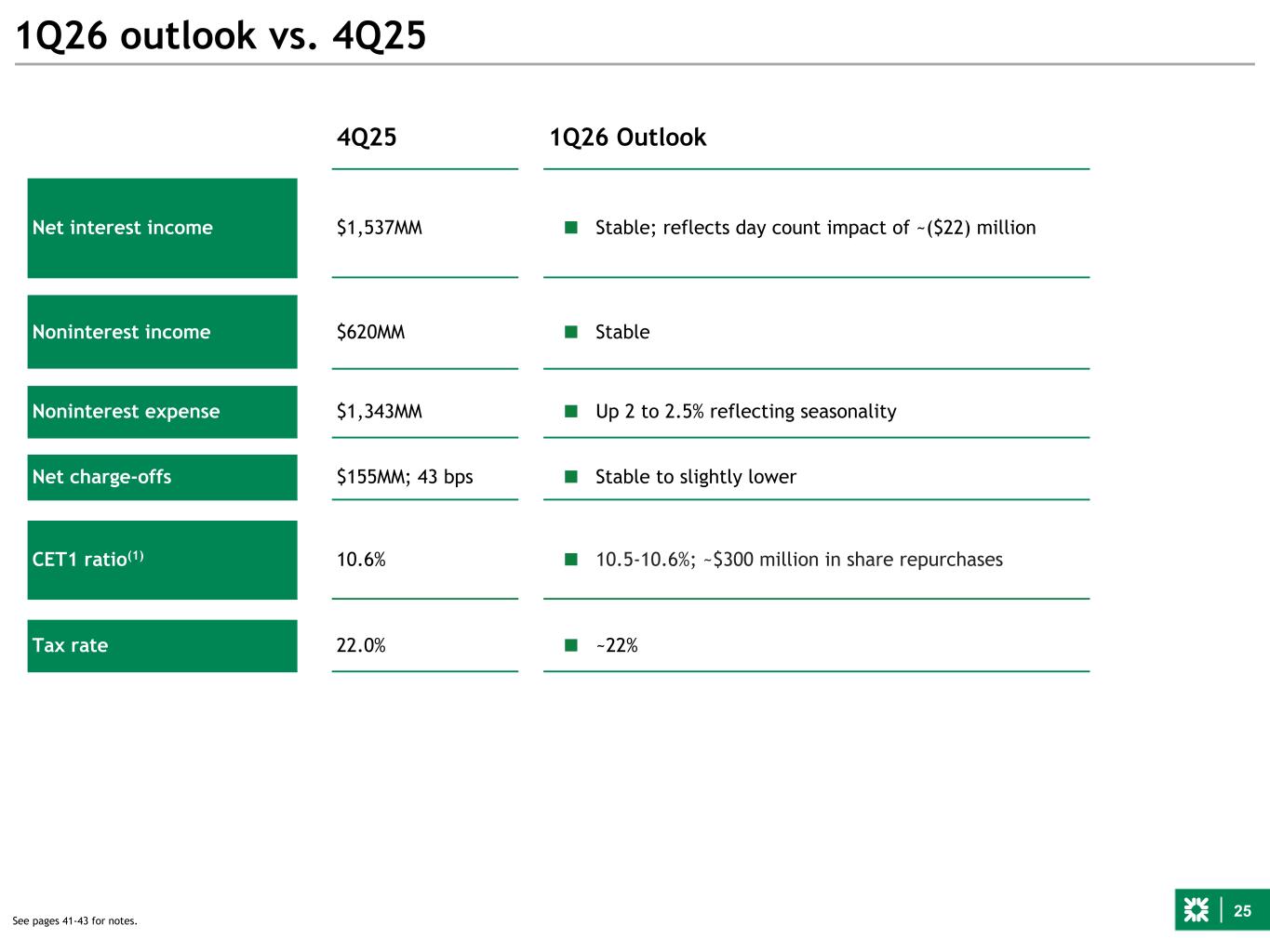 25 1Q26 outlook vs. 4Q25 See pages 41-43 for notes. 4Q25 1Q26 Outlook Net interest income $1,537MM ■ Stable; reflects day count impact of ~($22) million Noninterest income $620MM ■ Stable Noninterest expense $1,343MM ■ Up 2 to 2.5% reflecting seasonality Net charge-offs $155MM; 43 bps ■ Stable to slightly lower CET1 ratio(1) 10.6% ■ 10.5-10.6%; ~$300 million in share repurchases Tax rate 22.0% ■ ~22%