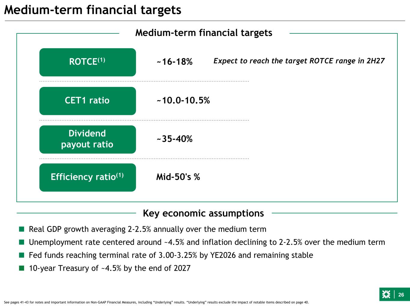 26 Medium-term financial targets Medium-term financial targets ROTCE(1) CET1 ratio Dividend payout ratio Efficiency ratio(1) ~16-18% ~10.0-10.5% ~35-40% Mid-50's % Key economic assumptions ■ Real GDP growth averaging 2-2.5% annually over the medium term ■ Unemployment rate centered around ~4.5% and inflation declining to 2-2.5% over the medium term ■ Fed funds reaching terminal rate of 3.00-3.25% by YE2026 and remaining stable ■ 10-year Treasury of ~4.5% by the end of 2027 Expect to reach the target ROTCE range in 2H27 See pages 41-43 for notes and important information on Non-GAAP Financial Measures, including “Underlying” results. “Underlying” results exclude the impact of notable items described on page 40.