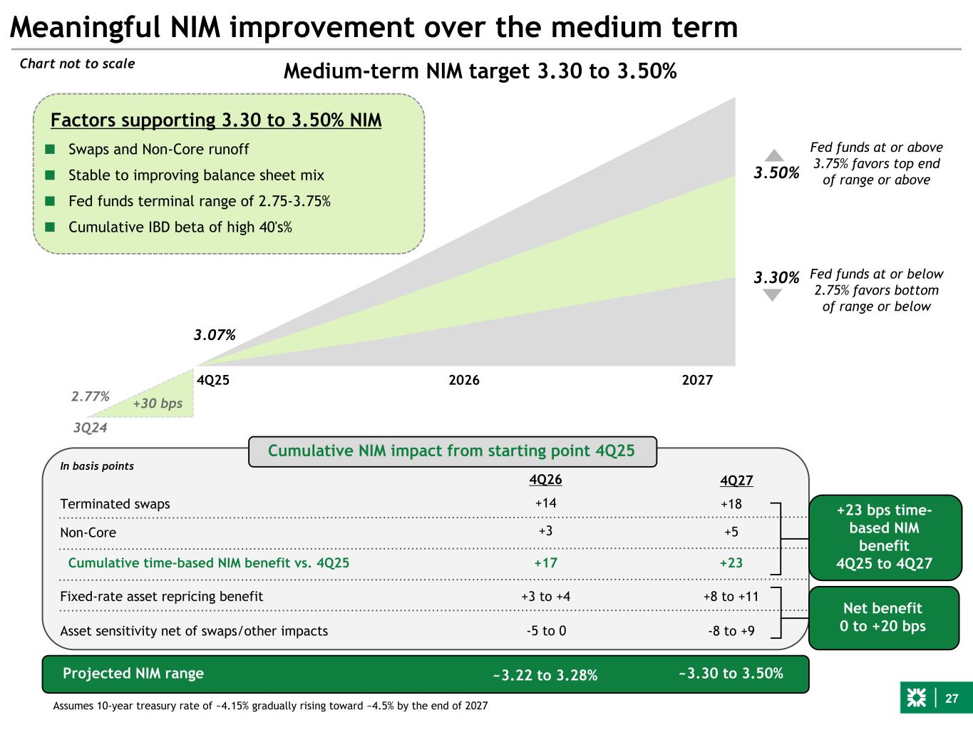 27 Meaningful NIM improvement over the medium term Medium-term NIM target 3.30 to 3.50% Terminated swaps Non-Core Asset sensitivity net of swaps/other impacts Projected NIM range Fixed-rate asset repricing benefit Cumulative time-based NIM benefit vs. 4Q25 4Q26 4Q27 In basis points +14 +3 +17 +18 +5 +23 +8 to +11 -8 to +9 ~3.30 to 3.50% Chart not to scale Net benefit 0 to +20 bps 3.30% 3.50% Fed funds at or above 3.75% favors top end of range or above Fed funds at or below 2.75% favors bottom of range or below Factors supporting 3.30 to 3.50% NIM ■ Swaps and Non-Core runoff ■ Stable to improving balance sheet mix ■ Fed funds terminal range of 2.75-3.75% ■ Cumulative IBD beta of high 40's% +23 bps time- based NIM benefit 4Q25 to 4Q27 Assumes 10-year treasury rate of ~4.15% gradually rising toward ~4.5% by the end of 2027 +3 to +4 Cumulative NIM impact from starting point 4Q25 3Q24 2.77% 4Q25 3.07% 2026 2027 +30 bps -5 to 0 ~3.22 to 3.28%