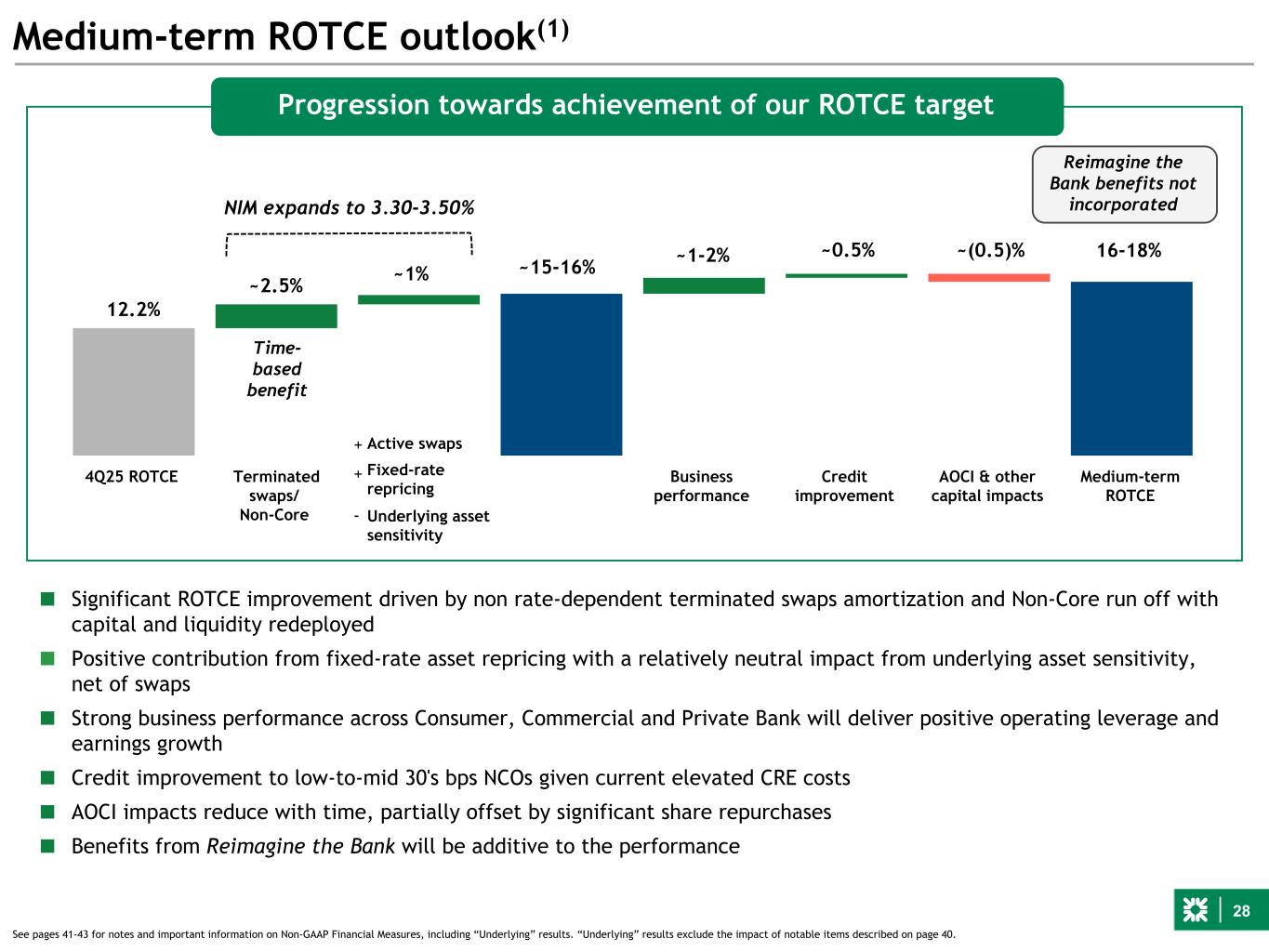28 4Q25 ROTCE Terminated swaps/ Non-Core Business performance Credit improvement AOCI & other capital impacts Medium-term ROTCE Medium-term ROTCE outlook(1) ■ Significant ROTCE improvement driven by non rate-dependent terminated swaps amortization and Non-Core run off with capital and liquidity redeployed ■ Positive contribution from fixed-rate asset repricing with a relatively neutral impact from underlying asset sensitivity, net of swaps ■ Strong business performance across Consumer, Commercial and Private Bank will deliver positive operating leverage and earnings growth ■ Credit improvement to low-to-mid 30's bps NCOs given current elevated CRE costs ■ AOCI impacts reduce with time, partially offset by significant share repurchases ■ Benefits from Reimagine the Bank will be additive to the performance Progression towards achievement of our ROTCE target 12.2% ~1% ~15-16% ~0.5% ~(0.5)%~1-2% ~2.5% NIM expands to 3.30-3.50% Active swaps Fixed-rate repricing Underlying asset sensitivity + + - Time- based benefit 16-18% Reimagine the Bank benefits not incorporated See pages 41-43 for notes and important information on Non-GAAP Financial Measures, including “Underlying” results. “Underlying” results exclude the impact of notable items described on page 40.