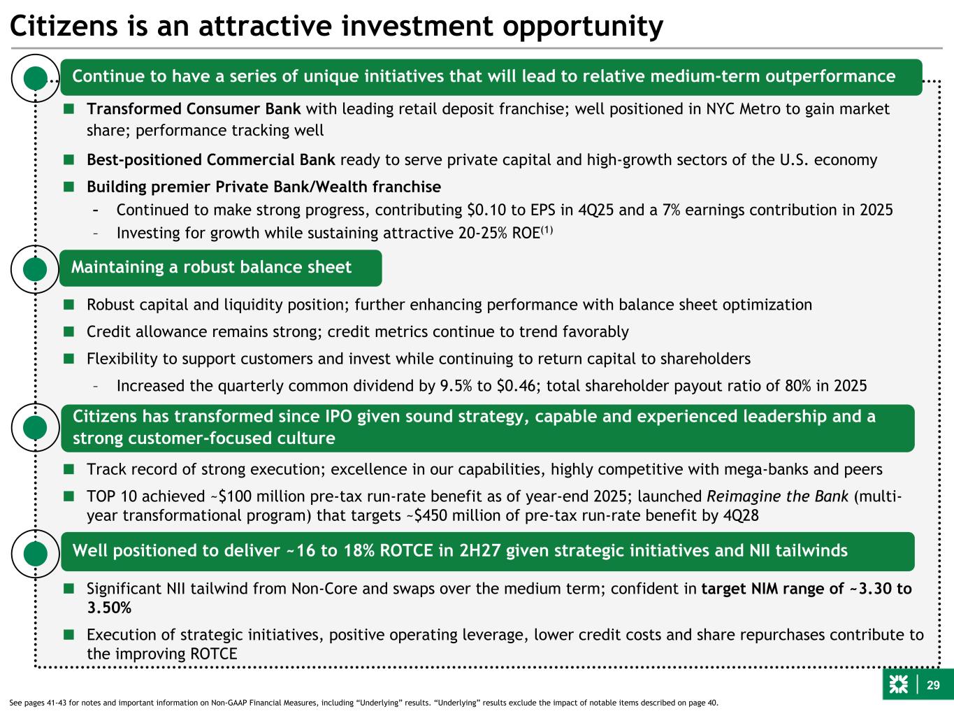 29 ■ Track record of strong execution; excellence in our capabilities, highly competitive with mega-banks and peers ■ TOP 10 achieved ~$100 million pre-tax run-rate benefit as of year-end 2025; launched Reimagine the Bank (multi- year transformational program) that targets ~$450 million of pre-tax run-rate benefit by 4Q28 ■ Robust capital and liquidity position; further enhancing performance with balance sheet optimization ■ Credit allowance remains strong; credit metrics continue to trend favorably ■ Flexibility to support customers and invest while continuing to return capital to shareholders – Increased the quarterly common dividend by 9.5% to $0.46; total shareholder payout ratio of 80% in 2025 Citizens is an attractive investment opportunity Maintaining a robust balance sheet Citizens has transformed since IPO given sound strategy, capable and experienced leadership and a strong customer-focused culture Well positioned to deliver ~16 to 18% ROTCE in 2H27 given strategic initiatives and NII tailwinds ■ Transformed Consumer Bank with leading retail deposit franchise; well positioned in NYC Metro to gain market share; performance tracking well ■ Best-positioned Commercial Bank ready to serve private capital and high-growth sectors of the U.S. economy ■ Building premier Private Bank/Wealth franchise – Continued to make strong progress, contributing $0.10 to EPS in 4Q25 and a 7% earnings contribution in 2025 – Investing for growth while sustaining attractive 20-25% ROE(1) ■ Significant NII tailwind from Non-Core and swaps over the medium term; confident in target NIM range of ~3.30 to 3.50% ■ Execution of strategic initiatives, positive operating leverage, lower credit costs and share repurchases contribute to the improving ROTCE Continue to have a series of unique initiatives that will lead to relative medium-term outperformance See pages 41-43 for notes and important information on Non-GAAP Financial Measures, including “Underlying” results. “Underlying” results exclude the impact of notable items described on page 40.