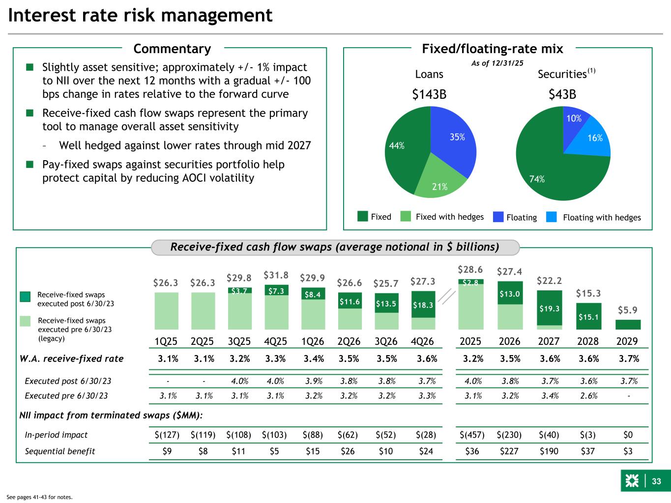 33 $26.3 $26.3 $29.8 $31.8 $29.9 $26.6 $25.7 $27.3 $3.7 $7.3 $8.4 $11.6 $13.5 $18.3 1Q25 2Q25 3Q25 4Q25 1Q26 2Q26 3Q26 4Q26 $28.6 $27.4 $22.2 $15.3 $5.9 $2.8 $13.0 $19.3 $15.1 2025 2026 2027 2028 2029 Interest rate risk management W.A. receive-fixed rate 3.1% 3.1% 3.2% 3.3% 3.4% 3.5% 3.5% 3.6% 3.2% 3.5% 3.6% 3.6% 3.7% Executed post 6/30/23 - - 4.0% 4.0% 3.9% 3.8% 3.8% 3.7% 4.0% 3.8% 3.7% 3.6% 3.7% Executed pre 6/30/23 3.1% 3.1% 3.1% 3.1% 3.2% 3.2% 3.2% 3.3% 3.1% 3.2% 3.4% 2.6% - NII impact from terminated swaps ($MM): In-period impact $(127) $(119) $(108) $(103) $(88) $(62) $(52) $(28) $(457) $(230) $(40) $(3) $0 Sequential benefit $9 $8 $11 $5 $15 $26 $10 $24 $36 $227 $190 $37 $3 Receive-fixed cash flow swaps (average notional in $ billions) ■ Slightly asset sensitive; approximately +/- 1% impact to NII over the next 12 months with a gradual +/- 100 bps change in rates relative to the forward curve ■ Receive-fixed cash flow swaps represent the primary tool to manage overall asset sensitivity – Well hedged against lower rates through mid 2027 ■ Pay-fixed swaps against securities portfolio help protect capital by reducing AOCI volatility Receive-fixed swaps executed post 6/30/23 Receive-fixed swaps executed pre 6/30/23 (legacy) Fixed/floating-rate mix 10% 16% 74% Securities $43B 35% 21% 44% Loans $143B Fixed Fixed with hedges Floating Floating with hedges Commentary 15% 15% 70% 37% 16% 47% As of 12/31/25 (1) See pages 41-43 for notes.