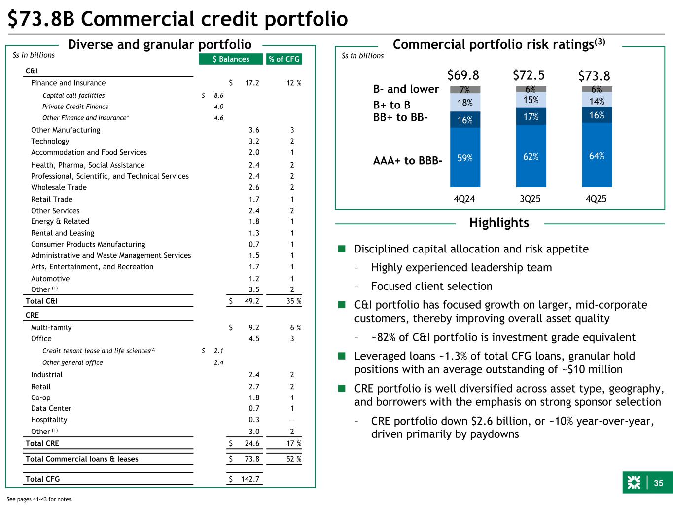 35 $73.8B Commercial credit portfolio Commercial portfolio risk ratings(3) $s in billions 59% 62% 64% 16% 17% 16% 18% 15% 14% 7% 6% 6% 4Q24 3Q25 4Q25 B- and lower B+ to B BB+ to BB- AAA+ to BBB- $73.8 Highlights $72.5 $ Balances % of CFG C&I Finance and Insurance $ 17.2 12 % Capital call facilities $ 8.6 Private Credit Finance 4.0 Other Finance and Insurance* 4.6 Other Manufacturing 3.6 3 Technology 3.2 2 Accommodation and Food Services 2.0 1 Health, Pharma, Social Assistance 2.4 2 Professional, Scientific, and Technical Services 2.4 2 Wholesale Trade 2.6 2 Retail Trade 1.7 1 Other Services 2.4 2 Energy & Related 1.8 1 Rental and Leasing 1.3 1 Consumer Products Manufacturing 0.7 1 Administrative and Waste Management Services 1.5 1 Arts, Entertainment, and Recreation 1.7 1 Automotive 1.2 1 Other (1) 3.5 2 Total C&I $ 49.2 35 % CRE Multi-family $ 9.2 6 % Office 4.5 3 Credit tenant lease and life sciences(2) $ 2.1 Other general office 2.4 Industrial 2.4 2 Retail 2.7 2 Co-op 1.8 1 Data Center 0.7 1 Hospitality 0.3 — Other (1) 3.0 2 Total CRE $ 24.6 17 % Total Commercial loans & leases $ 73.8 52 % Total CFG $ 142.7 Diverse and granular portfolio ■ Disciplined capital allocation and risk appetite – Highly experienced leadership team – Focused client selection ■ C&I portfolio has focused growth on larger, mid-corporate customers, thereby improving overall asset quality – ~82% of C&I portfolio is investment grade equivalent ■ Leveraged loans ~1.3% of total CFG loans, granular hold positions with an average outstanding of ~$10 million ■ CRE portfolio is well diversified across asset type, geography, and borrowers with the emphasis on strong sponsor selection – CRE portfolio down $2.6 billion, or ~10% year-over-year, driven primarily by paydowns $69.8 See pages 41-43 for notes. $s in billions ■ [Non-depository financial institution (NDFI) balance under regulatory definition of [$15.9] billion; BBB- ratings equivalent]