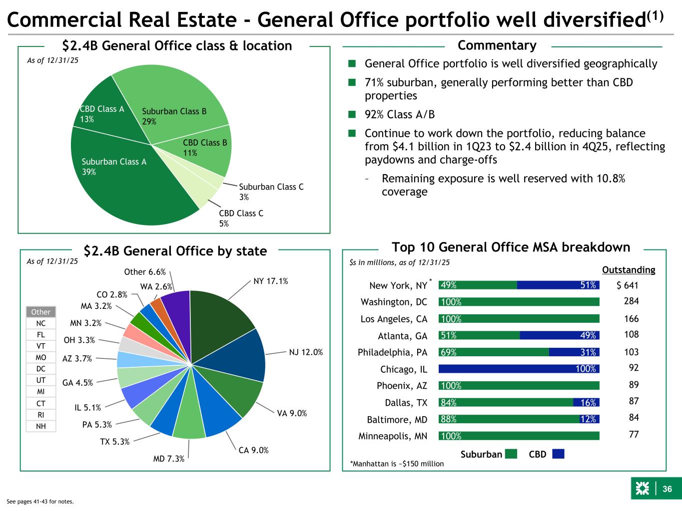 36 Suburban Class C 3% CBD Class C 5% Suburban Class A 39% CBD Class A 13% Suburban Class B 29% CBD Class B 11% 49% 100% 100% 51% 69% 100% 84% 88% 100% 51% 49% 31% 100% 16% 12% New York, NY Washington, DC Los Angeles, CA Atlanta, GA Philadelphia, PA Chicago, IL Phoenix, AZ Dallas, TX Baltimore, MD Minneapolis, MN Suburban CBD NY 17.1% NJ 12.0% VA 9.0% CA 9.0% MD 7.3% TX 5.3% PA 5.3% IL 5.1% GA 4.5% AZ 3.7% OH 3.3% MN 3.2% MA 3.2% CO 2.8% WA 2.6% Other 6.6% Commercial Real Estate - General Office portfolio well diversified(1) $2.4B General Office by state Other NC FL VT MO DC UT MI CT RI NH $2.4B General Office class & location Outstanding *Manhattan is ~$150 million $ 641 284 166 108 103 92 89 87 84 77 $s in millions, as of 12/31/25 See pages 41-43 for notes. As of 12/31/25 As of 12/31/25 Commentary ■ General Office portfolio is well diversified geographically ■ 71% suburban, generally performing better than CBD properties ■ 92% Class A/B ■ Continue to work down the portfolio, reducing balance from $4.1 billion in 1Q23 to $2.4 billion in 4Q25, reflecting paydowns and charge-offs – Remaining exposure is well reserved with 10.8% coverage Top 10 General Office MSA breakdown *