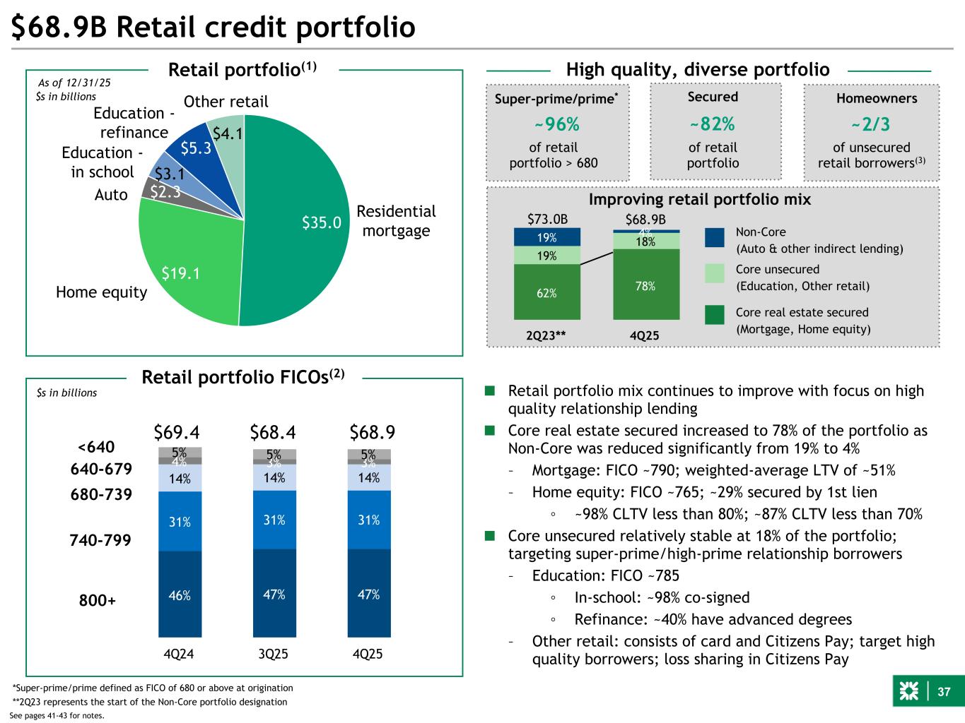 37 46% 47% 47% 31% 31% 31% 14% 14% 14% 4% 3% 3% 5% 5% 5% 4Q24 3Q25 4Q25 $35.0 $19.1 $2.3 $3.1 $5.3 $4.1 $68.9B Retail credit portfolio 800+ 740-799 680-739 640-679 <640 $68.9 $s in billions $68.4 Home equity Retail portfolio(1) Residential mortgage Auto Education - in school Education - refinance Other retail ~96% Super-prime/prime* ~82% Secured ■ Retail portfolio mix continues to improve with focus on high quality relationship lending ■ Core real estate secured increased to 78% of the portfolio as Non-Core was reduced significantly from 19% to 4% – Mortgage: FICO ~790; weighted-average LTV of ~51% – Home equity: FICO ~765; ~29% secured by 1st lien ◦ ~98% CLTV less than 80%; ~87% CLTV less than 70% ■ Core unsecured relatively stable at 18% of the portfolio; targeting super-prime/high-prime relationship borrowers – Education: FICO ~785 ◦ In-school: ~98% co-signed ◦ Refinance: ~40% have advanced degrees – Other retail: consists of card and Citizens Pay; target high quality borrowers; loss sharing in Citizens Pay High quality, diverse portfolio *Super-prime/prime defined as FICO of 680 or above at origination Retail portfolio FICOs(2) $69.4 Homeowners ~2/3 See pages 41-43 for notes. As of 12/31/25 62% 78% 19% 18%19% 4% 2Q23** 4Q25 Non-Core (Auto & other indirect lending) Core unsecured (Education, Other retail) Core real estate secured (Mortgage, Home equity) of unsecured retail borrowers(3) of retail portfolio > 680 Improving retail portfolio mix of retail portfolio **2Q23 represents the start of the Non-Core portfolio designation $68.9B$73.0B $s in billions