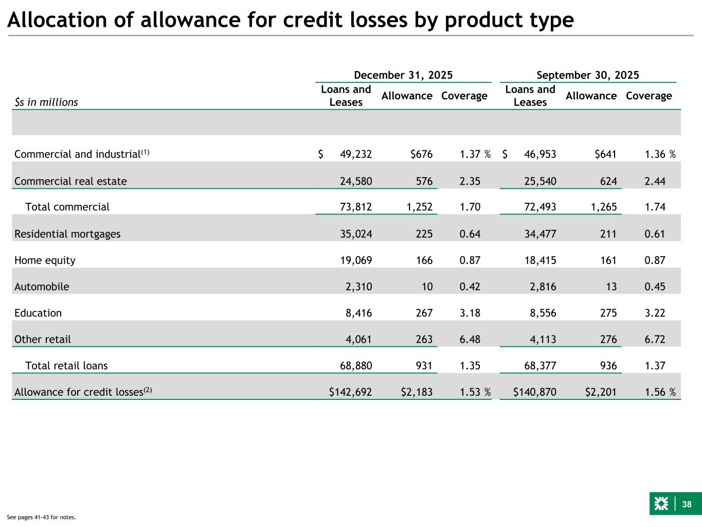 38 Allocation of allowance for credit losses by product type December 31, 2025 September 30, 2025 $s in millions Loans and Leases Allowance Coverage Loans and Leases Allowance Coverage Commercial and industrial(1) $ 49,232 $676 1.37 % $ 46,953 $641 1.36 % Commercial real estate 24,580 576 2.35 25,540 624 2.44 Total commercial 73,812 1,252 1.70 72,493 1,265 1.74 Residential mortgages 35,024 225 0.64 34,477 211 0.61 Home equity 19,069 166 0.87 18,415 161 0.87 Automobile 2,310 10 0.42 2,816 13 0.45 Education 8,416 267 3.18 8,556 275 3.22 Other retail 4,061 263 6.48 4,113 276 6.72 Total retail loans 68,880 931 1.35 68,377 936 1.37 Allowance for credit losses(2) $142,692 $2,183 1.53 % $140,870 $2,201 1.56 % See pages 41-43 for notes.