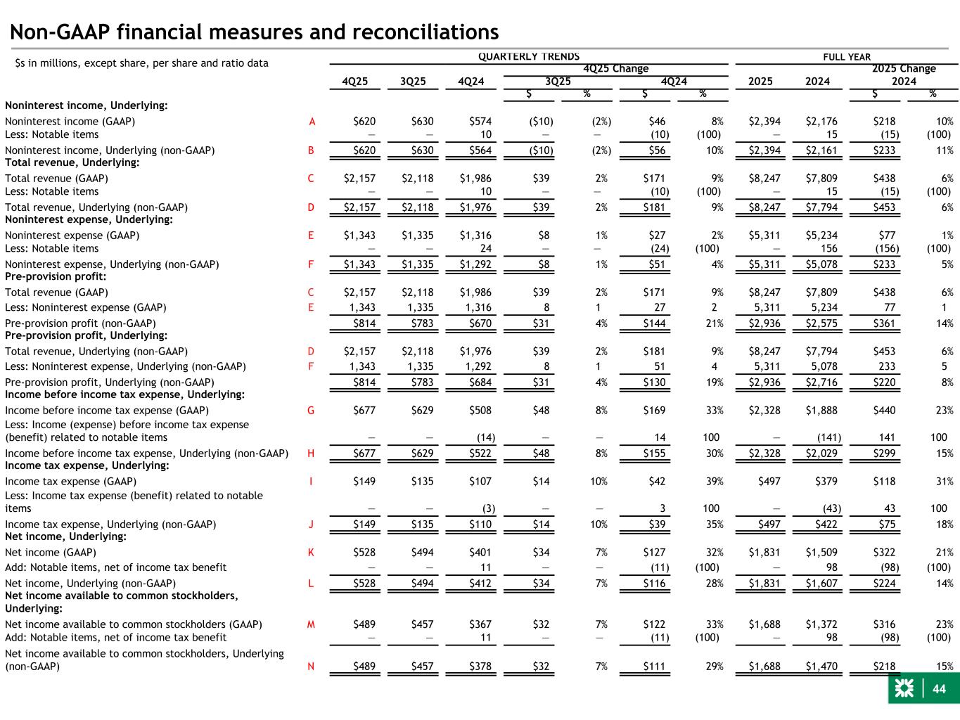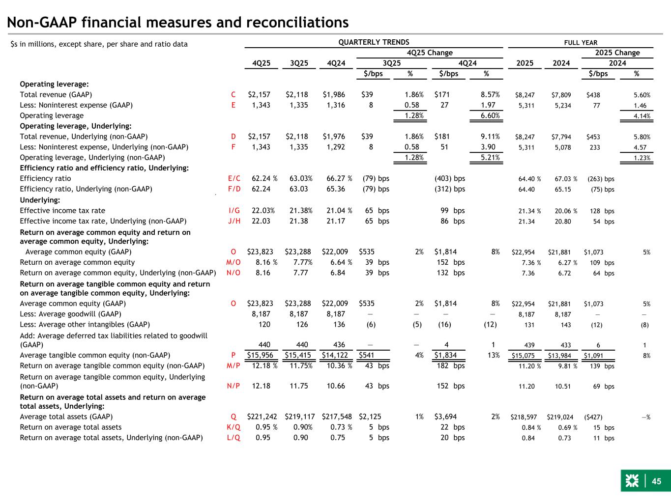 44 Non-GAAP financial measures and reconciliations $s in millions, except share, per share and ratio data QUARTERLY TRENDS FULL YEAR 4Q25 Change 2025 Change 4Q25 3Q25 4Q24 3Q25 4Q24 2025 2024 2024 $ % $ % $ % Noninterest income, Underlying: Noninterest income (GAAP) A $620 $630 $574 ($10) (2%) $46 8% $2,394 $2,176 $218 10% Less: Notable items — — 10 — — (10) (100) — 15 (15) (100) Noninterest income, Underlying (non-GAAP) B $620 $630 $564 ($10) (2%) $56 10% $2,394 $2,161 $233 11% Total revenue, Underlying: Total revenue (GAAP) C $2,157 $2,118 $1,986 $39 2% $171 9% $8,247 $7,809 $438 6% Less: Notable items — — 10 — — (10) (100) — 15 (15) (100) Total revenue, Underlying (non-GAAP) D $2,157 $2,118 $1,976 $39 2% $181 9% $8,247 $7,794 $453 6% Noninterest expense, Underlying: Noninterest expense (GAAP) E $1,343 $1,335 $1,316 $8 1% $27 2% $5,311 $5,234 $77 1% Less: Notable items — — 24 — — (24) (100) — 156 (156) (100) Noninterest expense, Underlying (non-GAAP) F $1,343 $1,335 $1,292 $8 1% $51 4% $5,311 $5,078 $233 5% Pre-provision profit: Total revenue (GAAP) C $2,157 $2,118 $1,986 $39 2% $171 9% $8,247 $7,809 $438 6% Less: Noninterest expense (GAAP) E 1,343 1,335 1,316 8 1 27 2 5,311 5,234 77 1 Pre-provision profit (non-GAAP) $814 $783 $670 $31 4% $144 21% $2,936 $2,575 $361 14% Pre-provision profit, Underlying: Total revenue, Underlying (non-GAAP) D $2,157 $2,118 $1,976 $39 2% $181 9% $8,247 $7,794 $453 6% Less: Noninterest expense, Underlying (non-GAAP) F 1,343 1,335 1,292 8 1 51 4 5,311 5,078 233 5 Pre-provision profit, Underlying (non-GAAP) $814 $783 $684 $31 4% $130 19% $2,936 $2,716 $220 8% Income before income tax expense, Underlying: Income before income tax expense (GAAP) G $677 $629 $508 $48 8% $169 33% $2,328 $1,888 $440 23% Less: Income (expense) before income tax expense (benefit) related to notable items — — (14) — — 14 100 — (141) 141 100 Income before income tax expense, Underlying (non-GAAP) H $677 $629 $522 $48 8% $155 30% $2,328 $2,029 $299 15% Income tax expense, Underlying: Income tax expense (GAAP) I $149 $135 $107 $14 10% $42 39% $497 $379 $118 31% Less: Income tax expense (benefit) related to notable items — — (3) — — 3 100 — (43) 43 100 Income tax expense, Underlying (non-GAAP) J $149 $135 $110 $14 10% $39 35% $497 $422 $75 18% Net income, Underlying: Net income (GAAP) K $528 $494 $401 $34 7% $127 32% $1,831 $1,509 $322 21% Add: Notable items, net of income tax benefit — — 11 — — (11) (100) — 98 (98) (100) Net income, Underlying (non-GAAP) L $528 $494 $412 $34 7% $116 28% $1,831 $1,607 $224 14% Net income available to common stockholders, Underlying: Net income available to common stockholders (GAAP) M $489 $457 $367 $32 7% $122 33% $1,688 $1,372 $316 23% Add: Notable items, net of income tax benefit — — 11 — — (11) (100) — 98 (98) (100) Net income available to common stockholders, Underlying (non-GAAP) N $489 $457 $378 $32 7% $111 29% $1,688 $1,470 $218 15%