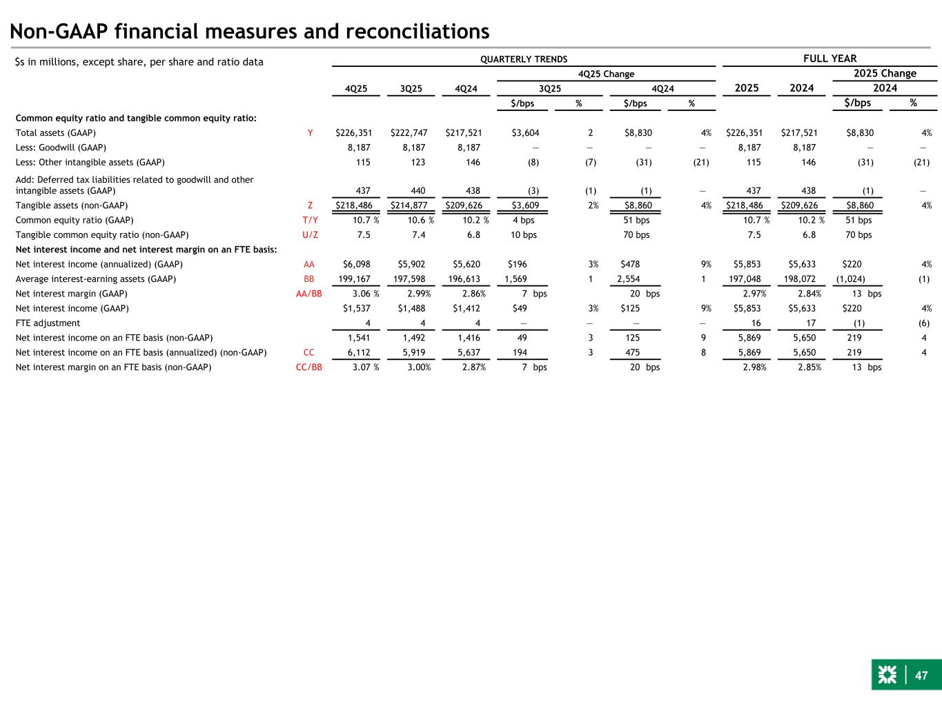 47 Non-GAAP financial measures and reconciliations QUARTERLY TRENDS FULL YEAR 4Q25 Change 2025 Change 4Q25 3Q25 4Q24 3Q25 4Q24 2025 2024 2024 $/bps % $/bps % $/bps % Common equity ratio and tangible common equity ratio: Total assets (GAAP) Y $226,351 $222,747 $217,521 $3,604 2 $8,830 4% $226,351 $217,521 $8,830 4% Less: Goodwill (GAAP) 8,187 8,187 8,187 — — — — 8,187 8,187 — — Less: Other intangible assets (GAAP) 115 123 146 (8) (7) (31) (21) 115 146 (31) (21) Add: Deferred tax liabilities related to goodwill and other intangible assets (GAAP) 437 440 438 (3) (1) (1) — 437 438 (1) — Tangible assets (non-GAAP) Z $218,486 $214,877 $209,626 $3,609 2% $8,860 4% $218,486 $209,626 $8,860 4% Common equity ratio (GAAP) T/Y 10.7 % 10.6 % 10.2 % 4 bps 51 bps 10.7 % 10.2 % 51 bps Tangible common equity ratio (non-GAAP) U/Z 7.5 7.4 6.8 10 bps 70 bps 7.5 6.8 70 bps Net interest income and net interest margin on an FTE basis: Net interest income (annualized) (GAAP) AA $6,098 $5,902 $5,620 $196 3% $478 9% $5,853 $5,633 $220 4% Average interest-earning assets (GAAP) BB 199,167 197,598 196,613 1,569 1 2,554 1 197,048 198,072 (1,024) (1) Net interest margin (GAAP) AA/BB 3.06 % 2.99% 2.86% 7 bps 20 bps 2.97% 2.84% 13 bps Net interest income (GAAP) $1,537 $1,488 $1,412 $49 3% $125 9% $5,853 $5,633 $220 4% FTE adjustment 4 4 4 — — — — 16 17 (1) (6) Net interest income on an FTE basis (non-GAAP) 1,541 1,492 1,416 49 3 125 9 5,869 5,650 219 4 Net interest income on an FTE basis (annualized) (non-GAAP) CC 6,112 5,919 5,637 194 3 475 8 5,869 5,650 219 4 Net interest margin on an FTE basis (non-GAAP) CC/BB 3.07 % 3.00% 2.87% 7 bps 20 bps 2.98% 2.85% 13 bps $s in millions, except share, per share and ratio data
