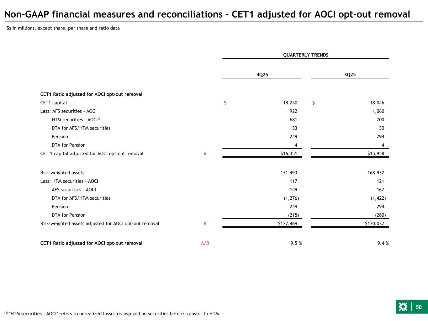 50 Non-GAAP financial measures and reconciliations - CET1 adjusted for AOCI opt-out removal QUARTERLY TRENDS 4Q25 3Q25 CET1 Ratio adjusted for AOCI opt-out removal CET1 capital $ 18,240 $ 18,046 Less: AFS securities - AOCI 922 1,060 HTM securities - AOCI(1) 681 700 DTA for AFS/HTM securities 33 30 Pension 249 294 DTA for Pension 4 4 CET 1 capital adjusted for AOCI opt-out removal A $16,351 $15,958 Risk-weighted assets 171,493 168,932 Less: HTM securities - AOCI 117 121 AFS securities - AOCI 149 167 DTA for AFS/HTM securities (1,276) (1,422) Pension 249 294 DTA for Pension (215) (260) Risk-weighted assets adjusted for AOCI opt-out removal B $172,469 $170,032 CET1 Ratio adjusted for AOCI opt-out removal A/B 9.5 % 9.4 % $s in millions, except share, per share and ratio data (1) "HTM securities - AOCI" refers to unrealized losses recognized on securities before transfer to HTM