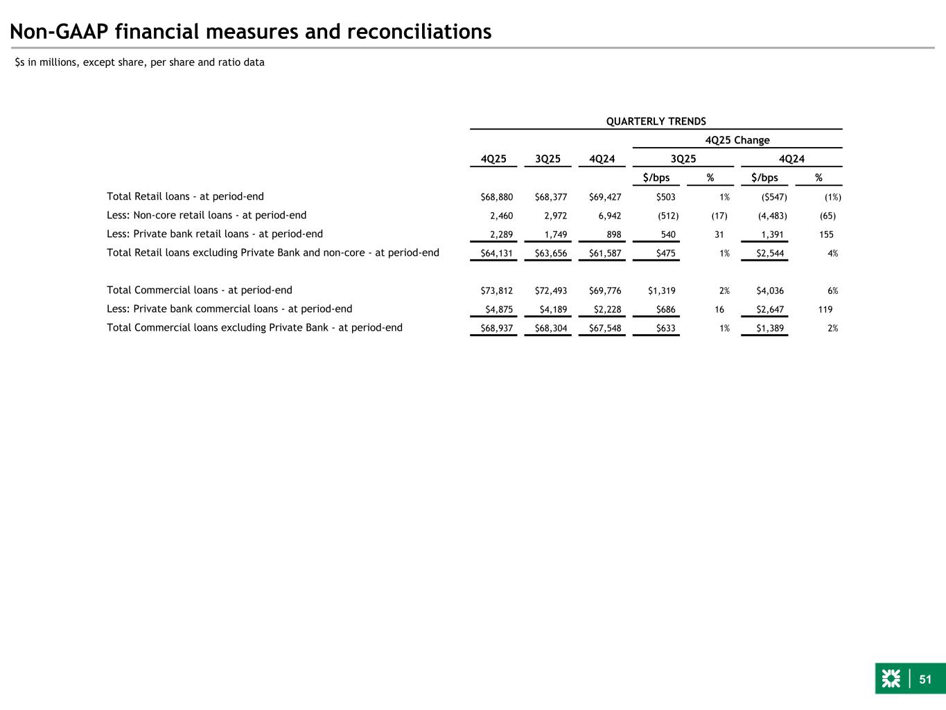 51 Non-GAAP financial measures and reconciliations QUARTERLY TRENDS 4Q25 Change 4Q25 3Q25 4Q24 3Q25 4Q24 $/bps % $/bps % Total Retail loans - at period-end $68,880 $68,377 $69,427 $503 1% ($547) (1%) Less: Non-core retail loans - at period-end 2,460 2,972 6,942 (512) (17) (4,483) (65) Less: Private bank retail loans - at period-end 2,289 1,749 898 540 31 1,391 155 Total Retail loans excluding Private Bank and non-core - at period-end $64,131 $63,656 $61,587 $475 1% $2,544 4% Total Commercial loans - at period-end $73,812 $72,493 $69,776 $1,319 2% $4,036 6% Less: Private bank commercial loans - at period-end $4,875 $4,189 $2,228 $686 16 $2,647 119 Total Commercial loans excluding Private Bank - at period-end $68,937 $68,304 $67,548 $633 1% $1,389 2% $s in millions, except share, per share and ratio data