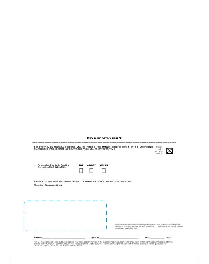 FOLD AND DETACH HERE BANCFIRST CORPORATION OKLAHOMA CITY, OKLAHOMA PROXY/VOTING INSTRUCTION CARD This proxy is solicited on behalf of the Board of Directors of BancFirst Corporation for the Annual Meeting on May 23, 2019. Your vote is important! Please sign and date on the reverse side and return promptly in the enclosed envelope. The undersigned hereby appoints David