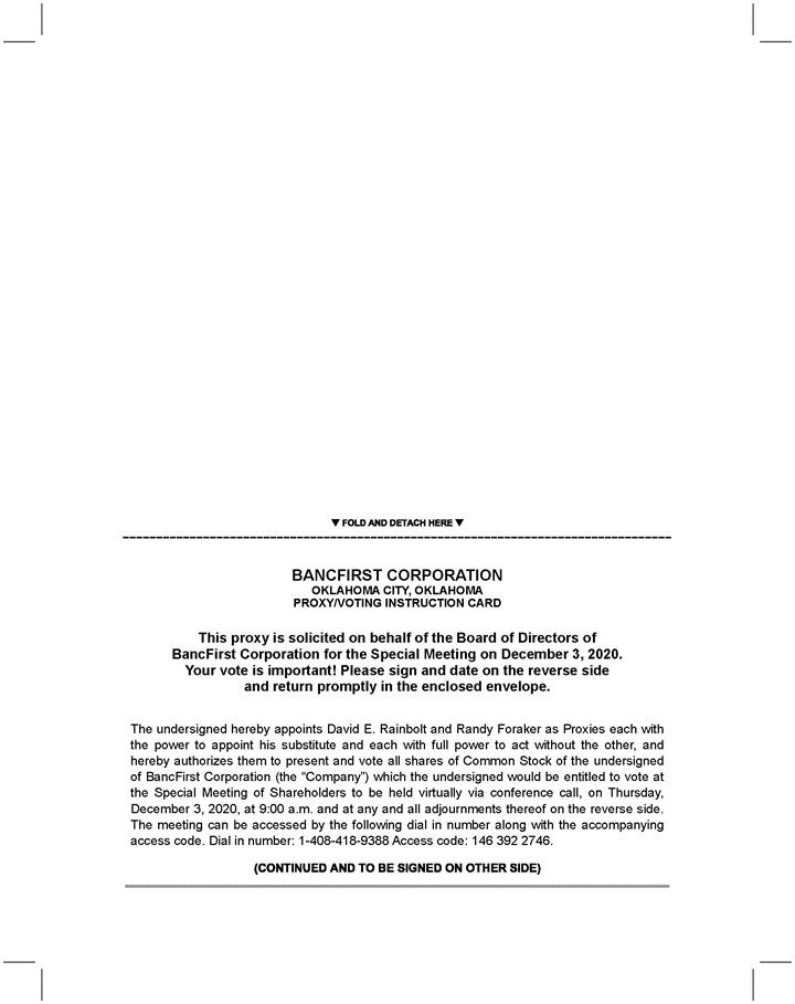 FOLD AND DETACH HERE BANCFIRST CORPORATION OKLAHOMA CITY, OKLAHOMA PROXY/VOTING INSTRUCTION CARD This proxy is solicited on behalf of the Board of Directors of BancFirst Corporation for the Annual Meeting on May 23, 2019. Your vote is important! Please sign and date on the reverse side and return promptly in the enclosed envelope. The undersigned hereby appoints David