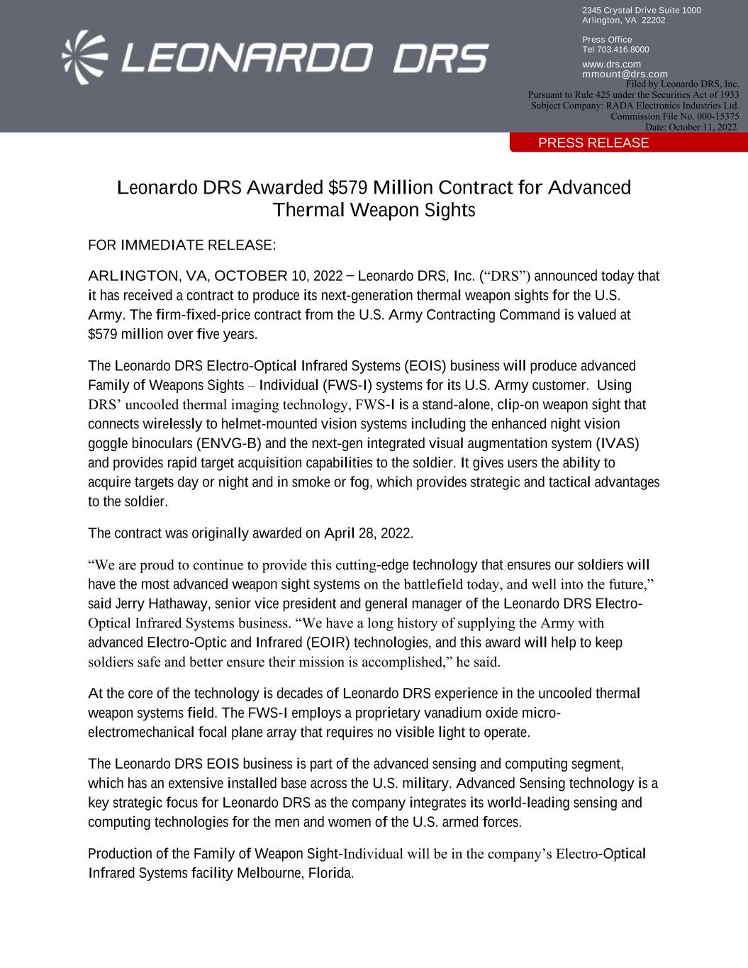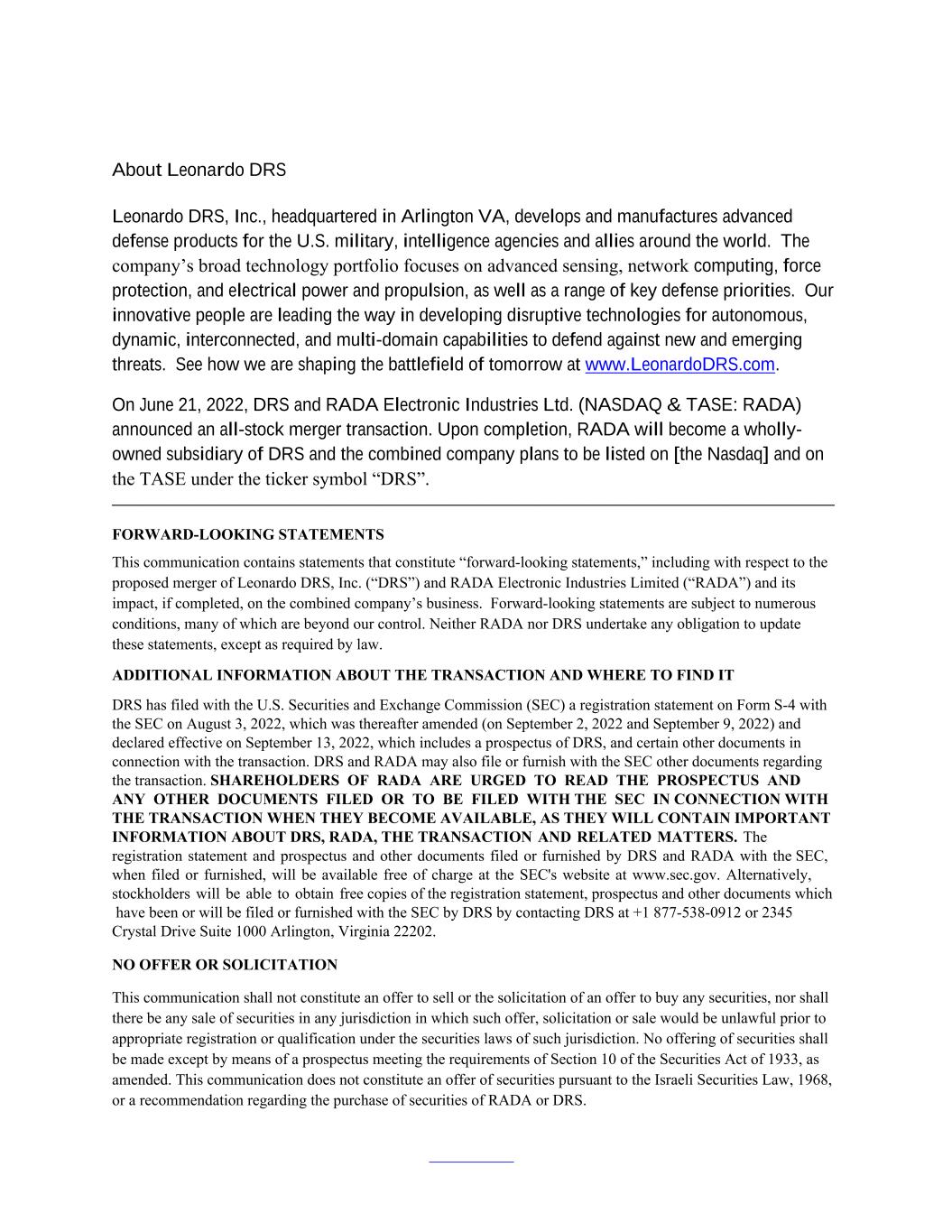 About Leonardo DRS Leonardo DRS, Inc., headquartered in Arlington VA, develops and manufactures advanced defense products for the U.S. military, intelligence agencies and allies around the world. The company’s broad technology portfolio focuses on advanced sensing, network computing, force protection, and electrical power and propulsion, as well as a range of key defense priorities. Our innovative people are leading the way in developing disruptive technologies for autonomous, dynamic, interconnected, and multi-domain capabilities to defend against new and emerging threats. See how we are shaping the battlefield of tomorrow at www.LeonardoDRS.com. _____________________________________________________________________________________________ On June 21, 2022, DRS and RADA Electronic Industries Ltd. (NASDAQ & TASE: RADA) announced an all-stock merger transaction. Upon completion, RADA will become a wholly- owned subsidiary of DRS and the combined company plans to be listed on [the Nasdaq] and on the TASE under the ticker symbol “DRS”. This communication contains statements that constitute “forward-looking statements,” including with respect to the proposed merger of Leonardo DRS, Inc. (“DRS”) and RADA Electronic Industries Limited (“RADA”) and its impact, if completed, on the combined company’s business. Forward-looking statements are subject to numerous conditions, many of which are beyond our control. Neither RADA nor DRS undertake any obligation to update these statements, except as required by law. ADDITIONAL INFORMATION ABOUT THE TRANSACTION AND WHERE TO FIND IT FORWARD-LOOKING STATEMENTS NO OFFER OR SOLICITATION DRS has filed with the U.S. Securities and Exchange Commission (SEC) a registration statement on Form S-4 with the SEC on August 3, 2022, which was thereafter amended (on September 2, 2022 and September 9, 2022) and declared effective on September 13, 2022, which includes a prospectus of DRS, and certain other documents in connection with the transaction. DRS and RADA may also file or furnish with the SEC other documents regarding the transaction. SHAREHOLDERS OF RADA ARE URGED TO READ THE PROSPECTUS AND ANY OTHER DOCUMENTS FILED OR TO BE FILED WITH THE SEC IN CONNECTION WITH THE TRANSACTION WHEN THEY BECOME AVAILABLE, AS THEY WILL CONTAIN IMPORTANT INFORMATION ABOUT DRS, RADA, THE TRANSACTION AND RELATED MATTERS. The registration statement and prospectus and other documents filed or furnished by DRS and RADA with the SEC, when filed or furnished, will be available free of charge at the SEC's website at www.sec.gov. Alternatively, stockholders will be able to obtain free copies of the registration statement, prospectus and other documents which have been or will be filed or furnished with the SEC by DRS by contacting DRS at +1 877-538-0912 or 2345 Crystal Drive Suite 1000 Arlington, Virginia 22202. This communication shall not constitute an offer to sell or the solicitation of an offer to buy any securities, nor shall there be any sale of securities in any jurisdiction in which such offer, solicitation or sale would be unlawful prior to appropriate registration or qualification under the securities laws of such jurisdiction. No offering of securities shall be made except by means of a prospectus meeting the requirements of Section 10 of the Securities Act of 1933, as amended. This communication does not constitute an offer of securities pursuant to the Israeli Securities Law, 1968, or a recommendation regarding the purchase of securities of RADA or DRS.