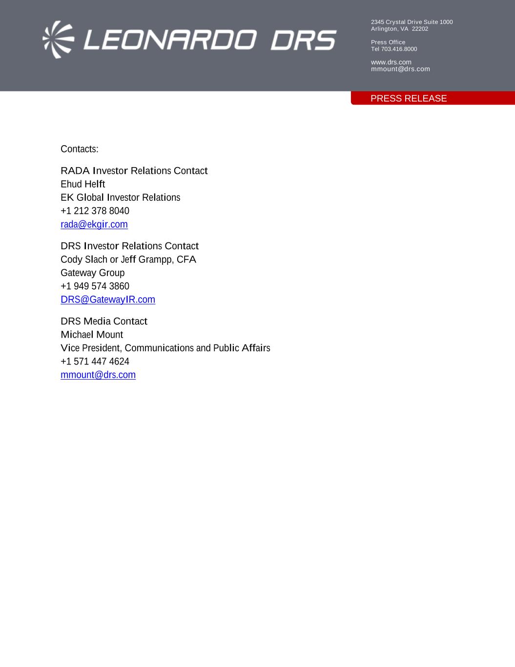2345 Crystal Drive Suite 1000 Arlington, VA 22202 Press Office Tel 703.416.8000 www.drs.com mmount@drs.com PRESS RELEASE Contacts: RADA Investor Relations Contact Ehud Helft EK Global Investor Relations +1 212 378 8040 rada@ekgir.com DRS Investor Relations Contact Cody Slach or Jeff Grampp, CFA Gateway Group +1 949 574 3860 DRS@GatewayIR.com DRS Media Contact Michael Mount Vice President, Communications and Public Affairs +1 571 447 4624 mmount@drs.com