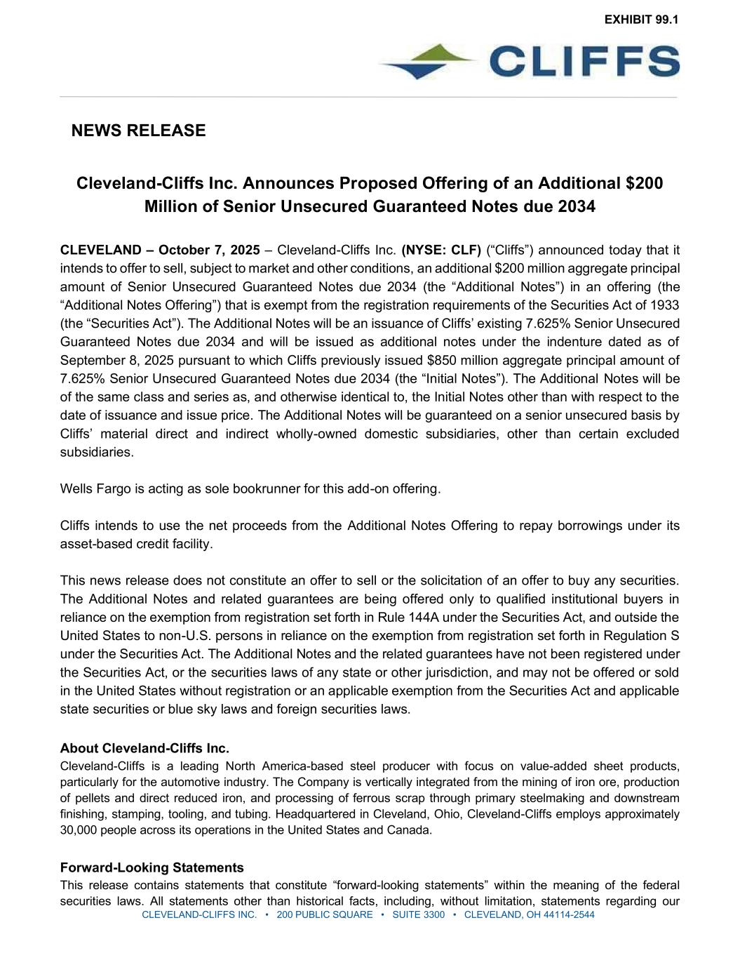 NEWS RELEASE Cleveland-Cliffs Inc. Announces Proposed Offering of an Additional $200 Million of Senior Unsecured Guaranteed Notes due 2034 CLEVELAND – October 7, 2025 – Cleveland-Cliffs Inc. (NYSE: CLF) (“Cliffs”) announced today that it intends to offer to sell, subject to market and other conditions, an additional $200 million aggregate principal amount of Senior Unsecured Guaranteed Notes due 2034 (the “Additional Notes”) in an offering (the “Additional Notes Offering”) that is exempt from the registration requirements of the Securities Act of 1933 (the “Securities Act”). The Additional Notes will be an issuance of Cliffs’ existing 7.625% Senior Unsecured Guaranteed Notes due 2034 and will be issued as additional notes under the indenture dated as of September 8, 2025 pursuant to which Cliffs previously issued $850 million aggregate principal amount of 7.625% Senior Unsecured Guaranteed Notes due 2034 (the “Initial Notes”). The Additional Notes will be of the same class and series as, and otherwise identical to, the Initial Notes other than with respect to the date of issuance and issue price. The Additional Notes will be guaranteed on a senior unsecured basis by Cliffs’ material direct and indirect wholly-owned domestic subsidiaries, other than certain excluded subsidiaries. Wells Fargo is acting as sole bookrunner for this add-on offering. Cliffs intends to use the net proceeds from the Additional Notes Offering to repay borrowings under its asset-based credit facility. This news release does not constitute an offer to sell or the solicitation of an offer to buy any securities. The Additional Notes and related guarantees are being offered only to qualified institutional buyers in reliance on the exemption from registration set forth in Rule 144A under the Securities Act, and outside the United States to non-U.S. persons in reliance on the exemption from registration set forth in Regulation S under the Securities Act. The Additional Notes and the related guarantees have not been registered under the Securities Act, or the securities laws of any state or other jurisdiction, and may not be offered or sold in the United States without registration or an applicable exemption from the Securities Act and applicable state securities or blue sky laws and foreign securities laws. About Cleveland-Cliffs Inc. Cleveland-Cliffs is a leading North America-based steel producer with focus on value-added sheet products, particularly for the automotive industry. The Company is vertically integrated from the mining of iron ore, production of pellets and direct reduced iron, and processing of ferrous scrap through primary steelmaking and downstream finishing, stamping, tooling, and tubing. Headquartered in Cleveland, Ohio, Cleveland-Cliffs employs approximately 30,000 people across its operations in the United States and Canada. Forward-Looking Statements This release contains statements that constitute “forward-looking statements” within the meaning of the federal securities laws. All statements other than historical facts, including, without limitation, statements regarding our CLEVELAND-CLIFFS INC. • 200 PUBLIC SQUARE • SUITE 3300 • CLEVELAND, OH 44114-2544
