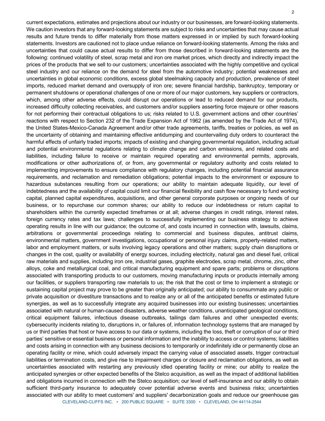 2 current expectations, estimates and projections about our industry or our businesses, are forward-looking statements. We caution investors that any forward-looking statements are subject to risks and uncertainties that may cause actual results and future trends to differ materially from those matters expressed in or implied by such forward-looking statements. Investors are cautioned not to place undue reliance on forward-looking statements. Among the risks and uncertainties that could cause actual results to differ from those described in forward-looking statements are the following: continued volatility of steel, scrap metal and iron ore market prices, which directly and indirectly impact the prices of the products that we sell to our customers; uncertainties associated with the highly competitive and cyclical steel industry and our reliance on the demand for steel from the automotive industry; potential weaknesses and uncertainties in global economic conditions, excess global steelmaking capacity and production, prevalence of steel imports, reduced market demand and oversupply of iron ore; severe financial hardship, bankruptcy, temporary or permanent shutdowns or operational challenges of one or more of our major customers, key suppliers or contractors, which, among other adverse effects, could disrupt our operations or lead to reduced demand for our products, increased difficulty collecting receivables, and customers and/or suppliers asserting force majeure or other reasons for not performing their contractual obligations to us; risks related to U.S. government actions and other countries’ reactions with respect to Section 232 of the Trade Expansion Act of 1962 (as amended by the Trade Act of 1974), the United States-Mexico-Canada Agreement and/or other trade agreements, tariffs, treaties or policies, as well as the uncertainty of obtaining and maintaining effective antidumping and countervailing duty orders to counteract the harmful effects of unfairly traded imports; impacts of existing and changing governmental regulation, including actual and potential environmental regulations relating to climate change and carbon emissions, and related costs and liabilities, including failure to receive or maintain required operating and environmental permits, approvals, modifications or other authorizations of, or from, any governmental or regulatory authority and costs related to implementing improvements to ensure compliance with regulatory changes, including potential financial assurance requirements, and reclamation and remediation obligations; potential impacts to the environment or exposure to hazardous substances resulting from our operations; our ability to maintain adequate liquidity, our level of indebtedness and the availability of capital could limit our financial flexibility and cash flow necessary to fund working capital, planned capital expenditures, acquisitions, and other general corporate purposes or ongoing needs of our business, or to repurchase our common shares; our ability to reduce our indebtedness or return capital to shareholders within the currently expected timeframes or at all; adverse changes in credit ratings, interest rates, foreign currency rates and tax laws; challenges to successfully implementing our business strategy to achieve operating results in line with our guidance; the outcome of, and costs incurred in connection with, lawsuits, claims, arbitrations or governmental proceedings relating to commercial and business disputes, antitrust claims, environmental matters, government investigations, occupational or personal injury claims, property-related matters, labor and employment matters, or suits involving legacy operations and other matters; supply chain disruptions or changes in the cost, quality or availability of energy sources, including electricity, natural gas and diesel fuel, critical raw materials and supplies, including iron ore, industrial gases, graphite electrodes, scrap metal, chrome, zinc, other alloys, coke and metallurgical coal, and critical manufacturing equipment and spare parts; problems or disruptions associated with transporting products to our customers, moving manufacturing inputs or products internally among our facilities, or suppliers transporting raw materials to us; the risk that the cost or time to implement a strategic or sustaining capital project may prove to be greater than originally anticipated; our ability to consummate any public or private acquisition or divestiture transactions and to realize any or all of the anticipated benefits or estimated future synergies, as well as to successfully integrate any acquired businesses into our existing businesses; uncertainties associated with natural or human-caused disasters, adverse weather conditions, unanticipated geological conditions, critical equipment failures, infectious disease outbreaks, tailings dam failures and other unexpected events; cybersecurity incidents relating to, disruptions in, or failures of, information technology systems that are managed by us or third parties that host or have access to our data or systems, including the loss, theft or corruption of our or third parties’ sensitive or essential business or personal information and the inability to access or control systems; liabilities and costs arising in connection with any business decisions to temporarily or indefinitely idle or permanently close an operating facility or mine, which could adversely impact the carrying value of associated assets, trigger contractual liabilities or termination costs, and give rise to impairment charges or closure and reclamation obligations, as well as uncertainties associated with restarting any previously idled operating facility or mine; our ability to realize the anticipated synergies or other expected benefits of the Stelco acquisition, as well as the impact of additional liabilities and obligations incurred in connection with the Stelco acquisition; our le