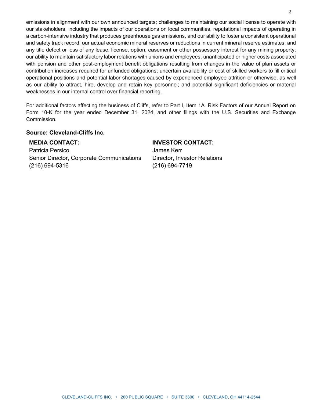 CLEVELAND-CLIFFS INC. • 200 PUBLIC SQUARE • SUITE 3300 • CLEVELAND, OH 44114-2544 3 emissions in alignment with our own announced targets; challenges to maintaining our social license to operate with our stakeholders, including the impacts of our operations on local communities, reputational impacts of operating in a carbon-intensive industry that produces greenhouse gas emissions, and our ability to foster a consistent operational and safety track record; our actual economic mineral reserves or reductions in current mineral reserve estimates, and any title defect or loss of any lease, license, option, easement or other possessory interest for any mining property; our ability to maintain satisfactory labor relations with unions and employees; unanticipated or higher costs associated with pension and other post-employment benefit obligations resulting from changes in the value of plan assets or contribution increases required for unfunded obligations; uncertain availability or cost of skilled workers to fill critical operational positions and potential labor shortages caused by experienced employee attrition or otherwise, as well as our ability to attract, hire, develop and retain key personnel; and potential significant deficiencies or material weaknesses in our internal control over financial reporting. For additional factors affecting the business of Cliffs, refer to Part I, Item 1A. Risk Factors of our Annual Report on Form 10-K for the year ended December 31, 2024, and other filings with the U.S. Securities and Exchange Commission. Source: Cleveland-Cliffs Inc. MEDIA CONTACT: Patricia Persico Senior Director, Corporate Communications (216) 694-5316 INVESTOR CONTACT: James Kerr Director, Investor Relations (216) 694-7719
