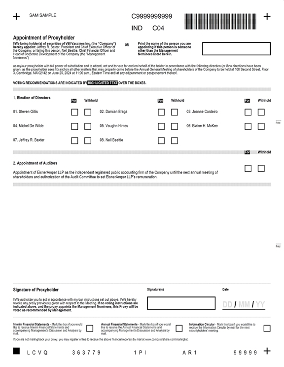 As of the date of this notice we are intending to hold the Annual Meeting in a physical format; however, we also have a contingency plan in place to move to a hybrid format by adding the option for online/teleconference participation or a virtual meeting format by way of online/teleconference participation only. If we take this step, we will announce the decision to do so as soon as practicable, and not less than one week prior to the Annual Meeting, via a press release that will be filed with the SEC as proxy material and on SEDAR+. The updated details will also be posted on our website at https://www.vbivaccines.com/. Please monitor our press releases and check our website regularly until the Annual Meeting for updated information.