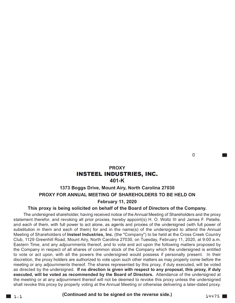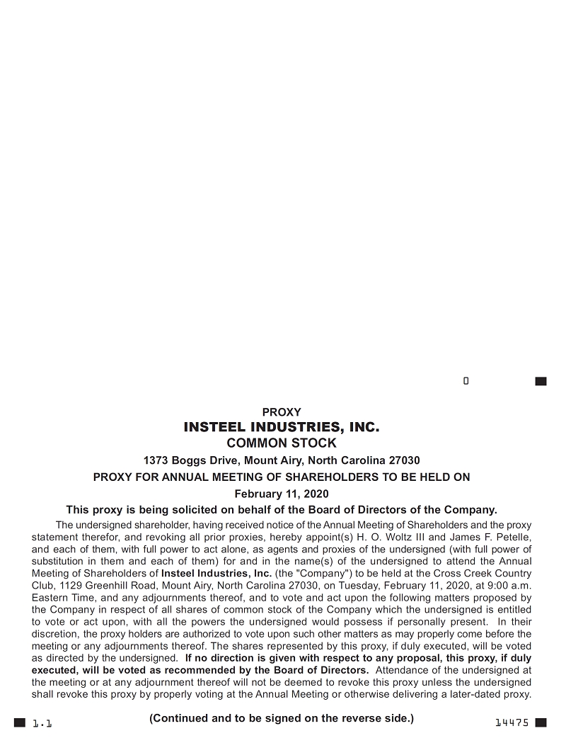 You are cordially invited to attend the 2020 Annual Meeting of Shareholders of Insteel Industries Inc. to be held February 11, 2020 at 9:00 a.m. Eastern Time. The meeting will take place at the Cross Creek Country Club, 1129 Greenhill Road, Mount Airy, North Carolina.