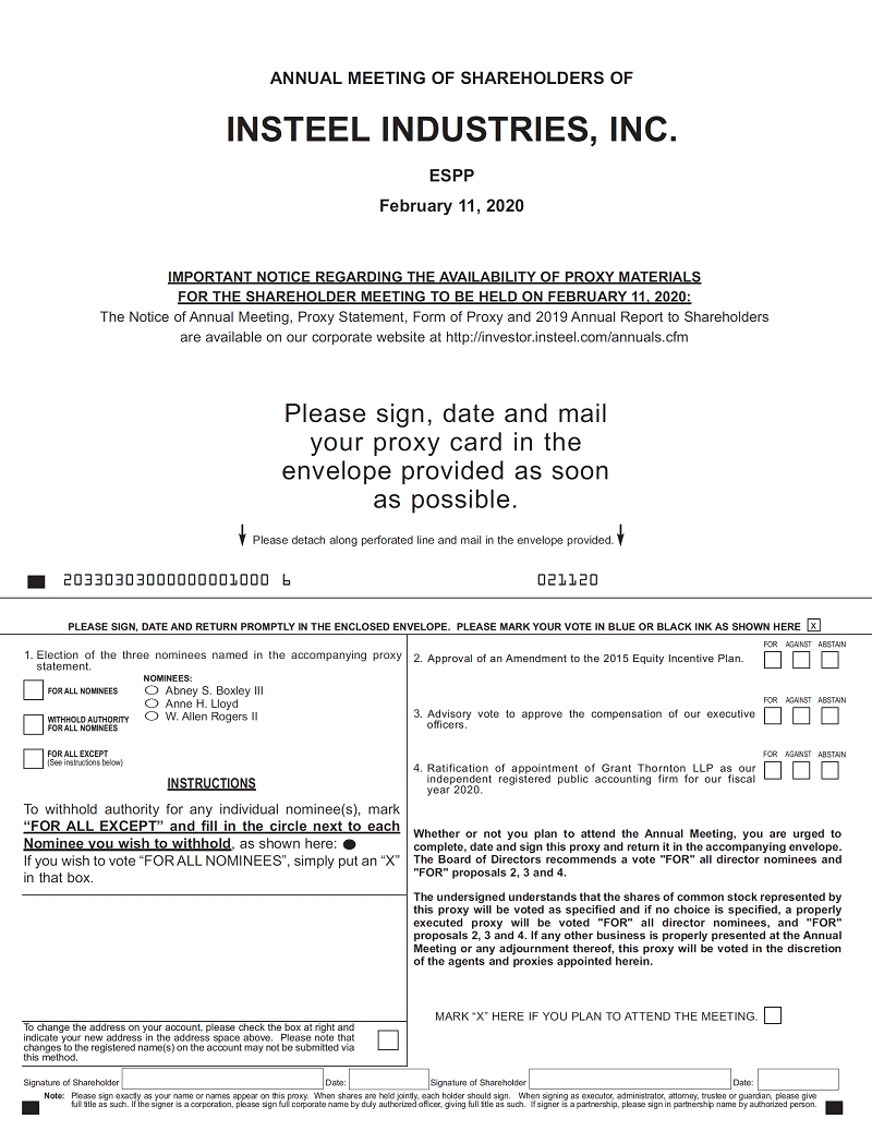 | 2. | Approve an amendment to the 2015 Equity Incentive Plan of Insteel Industries Inc., primarily to authorize an increase in the number of our common shares reserved for issuance thereunder; |