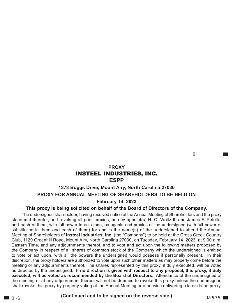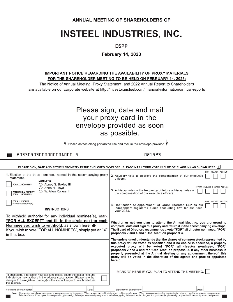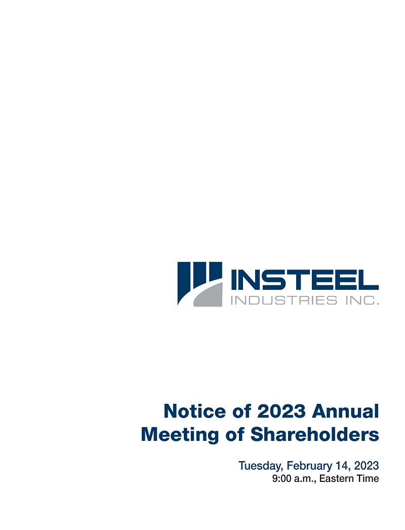 You are cordially invited to attend the 2023 Annual Meeting of Shareholders of Insteel Industries Inc. to be held February 14, 2023 at 9:00 a.m. Eastern Time. The meeting will take place at the Cross Creek Country Club, 1129 Greenhill Road, Mount Airy, North Carolina.