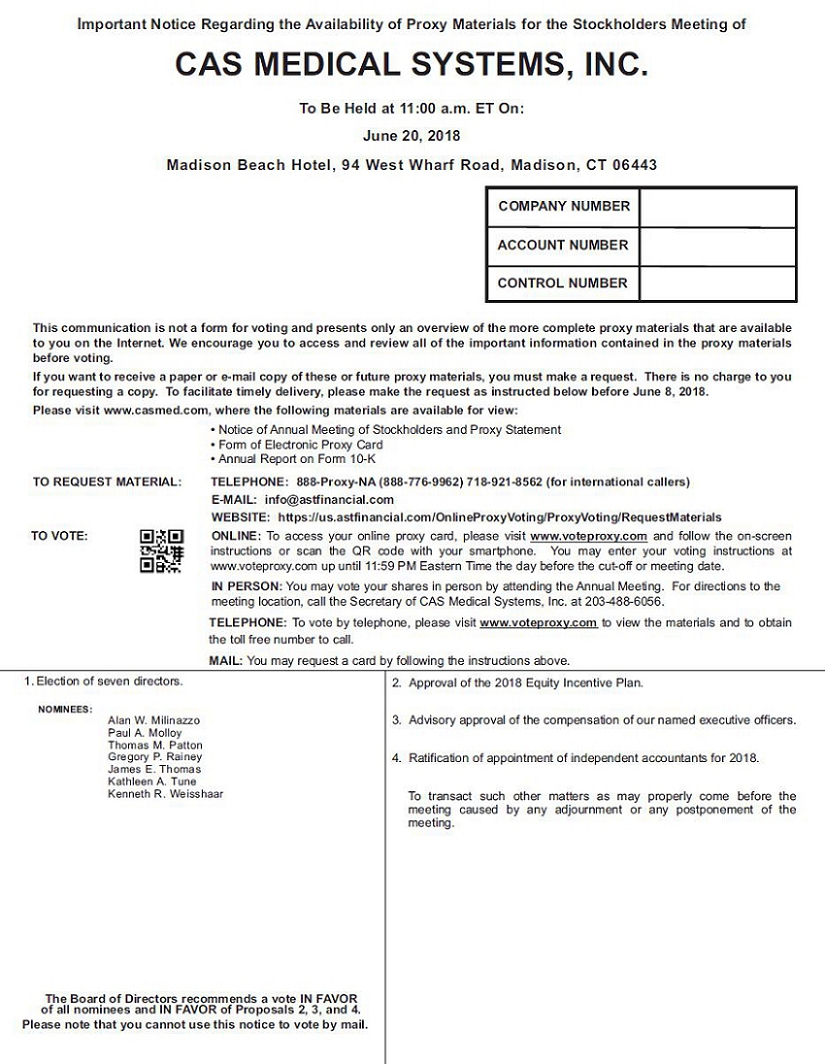Important Notice Regarding the Availability of Proxy Materials for the Stockholders Meeting of CAS MEDICAL SYSTEMS, INC. To Be Held at 11:00 a.m. ET On: June 20, 2018 Madison Beach Hotel, 94 West Wharf Road, Madison, CT 06443 COMPANY NUMBER ACCOUNT NUMBER CONTROL NUMBER. This communication is not a form for voting and presents only an overview of the more complete proxy materials that are available to you on the Internet. We encourage you to access and review all of the important information contained in the proxy materials before voting. If you want to receive a paper or e-mail copy of these or future proxy materials, you must make a request. There is no charge to you for requesting a copy. To facilitate timely delivery, please make the request as instructed below before June 8, 2018. Please visit www.casmed.com, where the following materials are available for view: Notice of Annual Meeting of Stockholders and Proxy Statement Form of Electronic Proxy Card Annual Report on Form 10-K TO REQUEST MATERIAL: TELEPHONE: 888-Proxy-NA (888-776-9962) 718-921-8562 (for international callers) E-MAIL: info@astfinancial.com WEBSITE: https://us.astfinancial.com/OnlineProxyVoting/ProxyVoting/RequestMaterials TO VOTE: ONLINE: To access your online proxy card, please visit www.voteproxy.com and follow the on-screen instructions or scan the QR code with your smartphone. You may enter your voting instructions at www.voteproxy.com up until 11:59 PM Eastern Time the day before the cut-off or meeting date. IN PERSON: You may vote your shares in person by attending the Annual Meeting. For directions to the meeting location, call the Secretary of CAS Medical Systems, Inc. at 203-488-6056. TELEPHONE: To vote by telephone, please visit www.voteproxy.com to view the materials and to obtain the toll free number to call. MAIL: You may request a card by following the instructions above. 1.Election of seven directors. NOMINEES: Alan W. Milinazzo Paul A. Molloy Thomas M. Patton Gregory P. Rainey James E. Thomas Kathleen A. Tune Kenneth R. Weisshaar 2. Approval of the 2018 Equity Incentive Plan. 3. Advisory approval of the compensation of our named executive officers. 4. Ratification of appointment of independent accountants for 2018. To transact such other matters as may properly come before the meeting caused by any adjournment or any postponement of the meeting. The Board of Directors recommends a vote IN FAVOR of all nominees and IN FAVOR of Proposals 2, 3, and 4. Please note that you cannot use this notice to vote by mail.