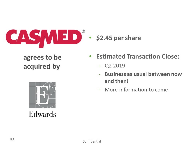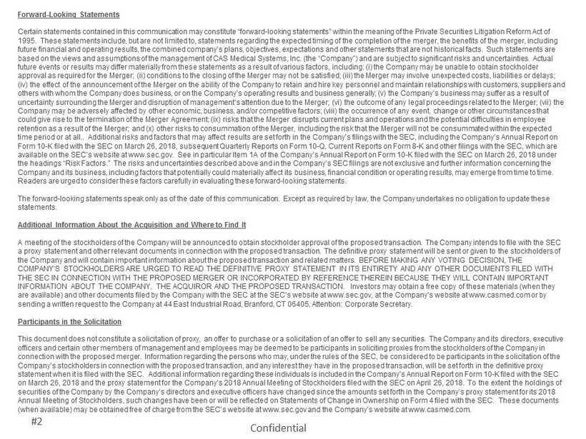 Confidential # 2 Forward - Looking Statements Certain statements contained in this communication may constitute “forward - looking statements” within the meaning of the Private Securities Litigation Reform Act of 1995. These statements include, but are not limited to, statements regarding the expected timing of the completion of the merge r, the benefits of the merger, including future financial and operating results, the combined company’s plans, objectives, expectations and other statements that are not historical facts. Such statements are based on the views and assumptions of the management of CAS Medical Systems, Inc. (the “Company”) and are subject to signific ant risks and uncertainties. Actual future events or results may differ materially from these statements as a result of various factors, including: (i) the Company may be unable to obtain stockholder approval as required for the Merger; (ii) conditions to the closing of the Merger may not be satisfied; (iii) the Merger may inv olve unexpected costs, liabilities or delays; (iv) the effect of the announcement of the Merger on the ability of the Company to retain and hire key personnel and maintain re lationships with customers, suppliers and others with whom the Company does business, or on the Company’s operating results and business generally; (v) the Company’s busi ness may suffer as a result of uncertainty surrounding the Merger and disruption of management’s attention due to the Merger; (vi) the outcome of any legal pro ceedings related to the Merger; (vii) the Company may be adversely affected by other economic, business, and/or competitive factors; (viii) the occurrence of any event, c hange or other circumstances that could give rise to the termination of the Merger Agreement; (ix) risks that the Merger disrupts current plans and operations and the potential difficulties in employee retention as a result of the Merger; and (x) other risks to consummation of the Merger, including the risk that the Merger will not be consummated within the expected time period or at all.. Additional risks and factors that may affect results are set forth in the Company’s filings with the SE C, including the Company’s Annual Report on Form 10 - K filed with the SEC on March 26, 2018, subsequent Quarterly Reports on Form 10 - Q, Current Reports on Form 8 - K and other filings with the SEC, which are available on the SEC’s website at www.sec.gov. See in particular Item 1A of the Company’s Annual Report on Form 10 - K filed with the SEC on March 26, 2018 under the headings “Risk Factors.” The risks and uncertainties described above and in the Company’s SEC filings are not exclusive and further information concerning the Company and its business, including factors that potentially could materially affect its business, financial condition or ope rat ing results, may emerge from time to time. Readers are urged to consider these factors carefully in evaluating these forward - looking statements. The forward - looking statements speak only as of the date of this communication. Except as required by law, the Company undertak es no obligation to update these statements. Additional Information About the Acquisition and Where to Find It A meeting of the stockholders of the Company will be announced to obtain stockholder approval of the proposed transaction. T he Company intends to file with the SEC a proxy statement and other relevant documents in connection with the proposed transaction. The definitive proxy statement w ill be sent or given to the stockholders of the Company and will contain important information about the proposed transaction and related matters. BEFORE MAKING ANY VOTING DECISION, THE COMPANY’S STOCKHOLDERS ARE URGED TO READ THE DEFINITIVE PROXY ST ATEMENT IN ITS ENTIRETY AND ANY OTHER DOCUMENTS FILED WITH THE SEC IN CONNECTION WITH THE PROPOSED MERGER OR INCORPORATED B Y REFERENCE THEREIN BECAUSE THEY WILL CONTAIN IMPORTANT INFORMATION ABOUT THE COMPANY, THE ACQUIROR AND THE PROPOSED TRA NSACTION . Investors may obtain a free copy of these materials (when they are available) and other documents filed by the Company with the SEC at the SEC’s website at www.sec.gov, at the Company’s we bsi te at www.casmed.com or by sending a written request to the Company at 44 East Industrial Road, Branford, CT 06405, Attention: Corporate Secretary. Participants in the Solicitation This document does not constitute a solicitation of proxy, an offer to purchase or a solicitation of an offer to sell any sec uri ties. The Company and its directors, executive officers and certain other members of management and employees may be deemed to be participants in soliciting proxies from th e s tockholders of the Company in connection with the proposed merger. Information regarding the persons who may, under the rules of the SEC, be considered to be participants in the solicitation of the Company’s stockholders in connection with the proposed transaction, and any interest they have in the proposed transaction, w ill be set forth in the definitive proxy statement when it is filed with the SEC. Additional information regarding these individuals is included in the Company’s Ann ual Report on Form 10 - K filed with the SEC on March 26, 2018 and the proxy statement for the Company’s 2018 Annual Meeting of Stockholders filed with the SEC on April 26, 2018. To the extent the holdings of securities of the Company by the Company’s directors and executive officers have changed since the amounts set forth in the C omp any’s proxy statement for its 2018 Annual Meeting of Stockholders, such changes have been or will be reflected on Statements of Change in Ownership on Form 4 fi led with the SEC. These documents (when available) may be obtained free of charge from the SEC’s website at www.sec.gov and the Company’s website at www.casmed .co m.