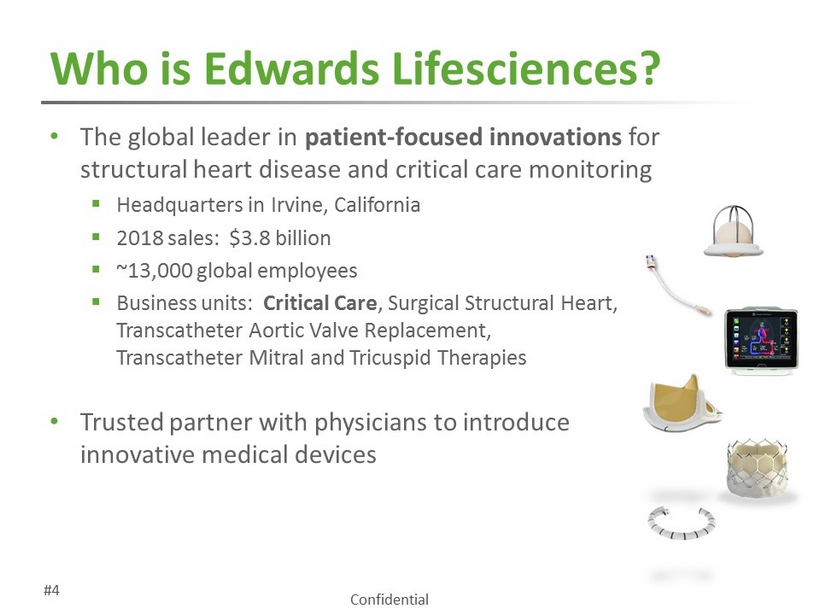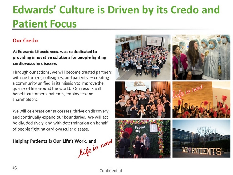 Confidential # 4 Who is Edwards Lifesciences? • The global leader in patient - focused innovations for structural heart disease and critical care monitoring ▪ Headquarters in Irvine, California ▪ 2018 sales: $3.8 billion ▪ ~13,000 global employees ▪ Business units: Critical Care , Surgical Structural Heart, Transcatheter Aortic Valve Replacement, Transcatheter Mitral and Tricuspid Therapies • Trusted partner with physicians to introduce innovative medical devices