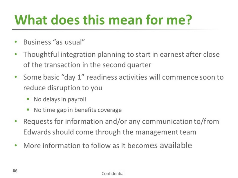 Confidential # 6 What does this mean for me? • Business “as usual” • Thoughtful integration planning to start in earnest after close of the transaction in the second quarter • Some basic “day 1” readiness activities will commence soon to reduce disruption to you ▪ No delays in payroll ▪ No time gap in benefits coverage • Requests for information and/or any communication to/from Edwards should come through the management team • More information to follow as it becom es available