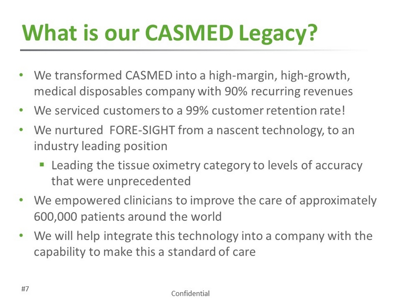 Confidential # 7 What is our CASMED Legacy? • We transformed CASMED into a high - margin, high - growth, medical disposables company with 90% recurring revenues • We serviced customers to a 99% customer retention rate! • We nurtured FORE - SIGHT from a nascent technology, to an industry leading position ▪ Leading the tissue oximetry category to levels of accuracy that were unprecedented • We empowered clinicians to improve the care of approximately 600,000 patients around the world • We will help integrate this technology into a company with the capability to make this a standard of care