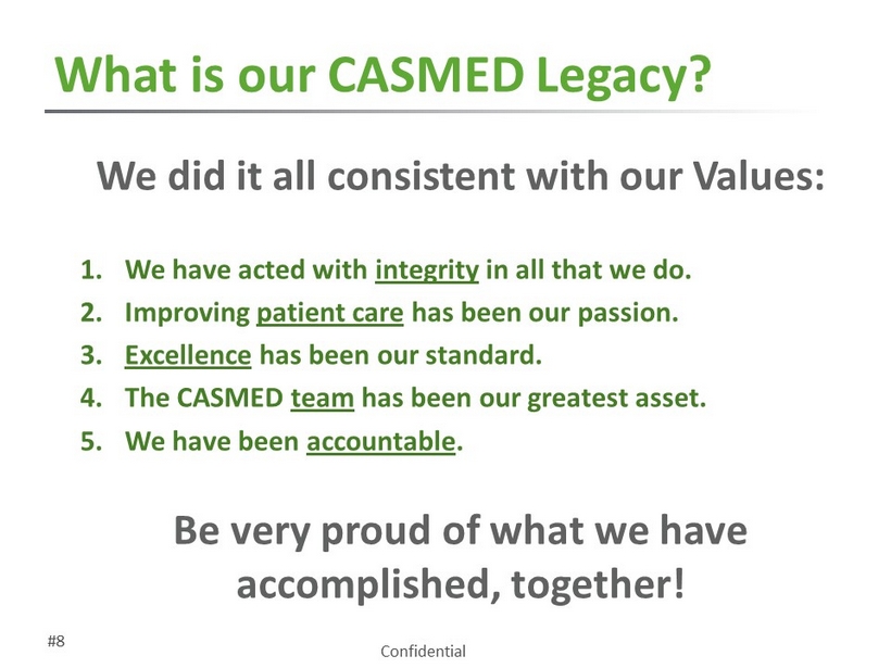 Confidential # 8 What is our CASMED Legacy? We did it all consistent with our Values: 1. We have acted with integrity in all that we do. 2. Improving patient care has been our passion. 3. Excellence has been our standard. 4. The CASMED team has been our greatest asset. 5. We have been accountable . Be very proud of what we have accomplished, together!