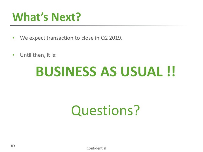 Confidential # 9 What’s Next? • We expect transaction to close in Q2 2019. • Until then, it is: BUSINESS AS USUAL !! Questions?