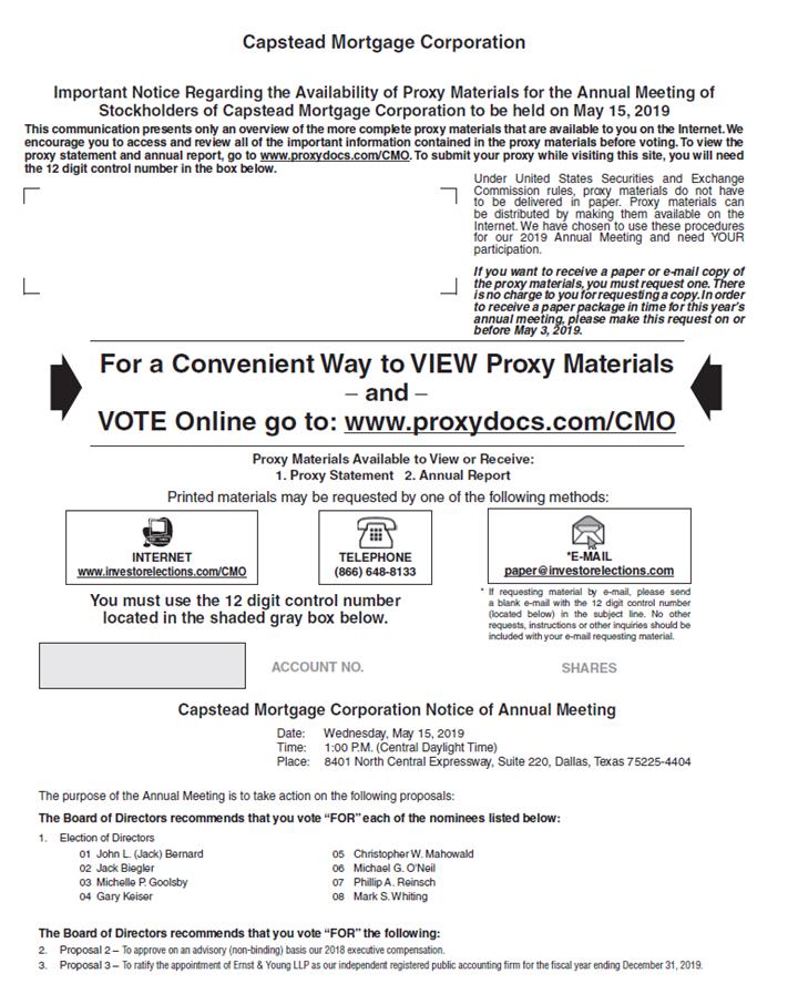 Capstead Mortgage Corporation Important Notice Regarding the Availability of Proxy Materials for the Annual Meeting of Stockholders of Capstead Mortgage Corporation to be held on May 15, 2019 This communication presents only an overview of the more complete proxy materials that are available to you on the Internet. We encourage you to access and review all of the important information contained in the proxy materials before voting. To view the proxy statement and annual report, go to www.proxydocs.com/CMO. To submit your proxy while visiting this site, you will need the 12 digit control number in the box below. Under United States Securities and Exchange Commission rules, proxy materials do not have to be delivered in paper. Proxy materials can be distributed by making them available on the Internet. We have chosen to use these procedures for our 2019 Annual Meeting and need YOUR participation. If you want to receive a paper or e-mail copy of the proxy materials, you must request one. There is no charge to you for requesting a copy. In order to receive a paper package in time for this year’s annual meeting, please make this request on or before May 3, 2019. For a Convenient Way to View Proxy Materials _ and _ VOTE Online go to: www.proxydocs.com/CMO Proxy Materials Available to View or Receive: 1. Proxy Statement 2. Annual Report Printed materials may be requested by one of the following methods: INTERNET www.investorelections.com/CMO You must use the 12 digit control number located in the shaded gray box below. TELEPHONE (866) 648-8133 *E-MAIL paper@investorelections.com * If requesting material by e-mail, please send a blank e-mail with the 12 digit control number (located below) in the subject line. No other requests, instructions or other inquiries should be included with your e-mail requesting material. ACCOUNT NO. SHARES The purpose of the Annual Meeting is to take action on the following proposals: The Board of Directors recommends that you vote “FOR” each of the nominees listed below: The Board of Directors recommends that you vote “FOR” the following: 2. Proposal 2 – To approve on an advisory (non-binding) basis our 2018 executive compensation. 3. Proposal 3 – To ratify the appointment of Ernst & Young LLP as our independent registered public accounting firm for the fiscal year ending December 31, 2019. 1. Election of Directors 01 John L. (Jack) Bernard 02 Jack Biegler 03 Michelle P. Goolsby 04 Gary Keiser 05 Christopher W. Mahowald 06 Michael G. O'Neil 07 Phillip A. Reinsch 08 Mark S. Whiting Date: Wednesday, May 15, 2019 Time: 1:00 P.M. (Central Daylight Time) Place: 8401 North Central Expressway, Suite 220, Dallas, Texas 75225-4404 Capstead Mortgage Corporation Notice of Annual Meeting