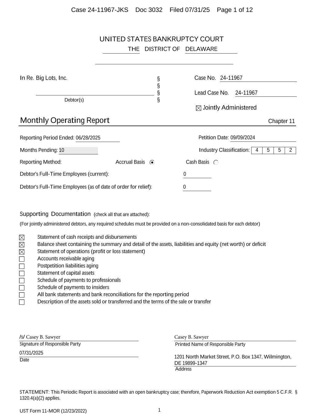 UST Form 11-MOR (12/23/2022) 1 UNITED STATES BANKRUPTCY COURT DISTRICT OFTHE DELAWARE In Re. Big Lots, Inc. Debtor(s) § § § § Case No. 24-11967 Lead Case No. 24-11967 Jointly Administered Monthly Operating Report Chapter 11 Reporting Period Ended: 06/28/2025 Petition Date: 09/09/2024 Months Pending: 10 Industry Classification: 4 5 5 2 Reporting Method: Accrual Basis Cash Basis Debtor's Full-Time Employees (current): 0 Debtor's Full-Time Employees (as of date of order for relief): 0 Supporting Documentation (check all that are attached): (For jointly administered debtors, any required schedules must be provided on a non-consolidated basis for each debtor) Statement of cash receipts and disbursements Balance sheet containing the summary and detail of the assets, liabilities and equity (net worth) or deficit Statement of operations (profit or loss statement) Accounts receivable aging Postpetition liabilities aging Statement of capital assets Schedule of payments to professionals Schedule of payments to insiders All bank statements and bank reconciliations for the reporting period Description of the assets sold or transferred and the terms of the sale or transfer Signature of Responsible Party Printed Name of Responsible Party Date Address /s/ Casey B. Sawyer 07/31/2025 Casey B. Sawyer 1201 North Market Street, P.O. Box 1347, Wilmington, DE 19899-1347 STATEMENT: This Periodic Report is associated with an open bankruptcy case; therefore, Paperwork Reduction Act exemption 5 C.F.R. § 1320.4(a)(2) applies. Case 24-11967-JKS Doc 3032 Filed 07/31/25 Page 1 of 12