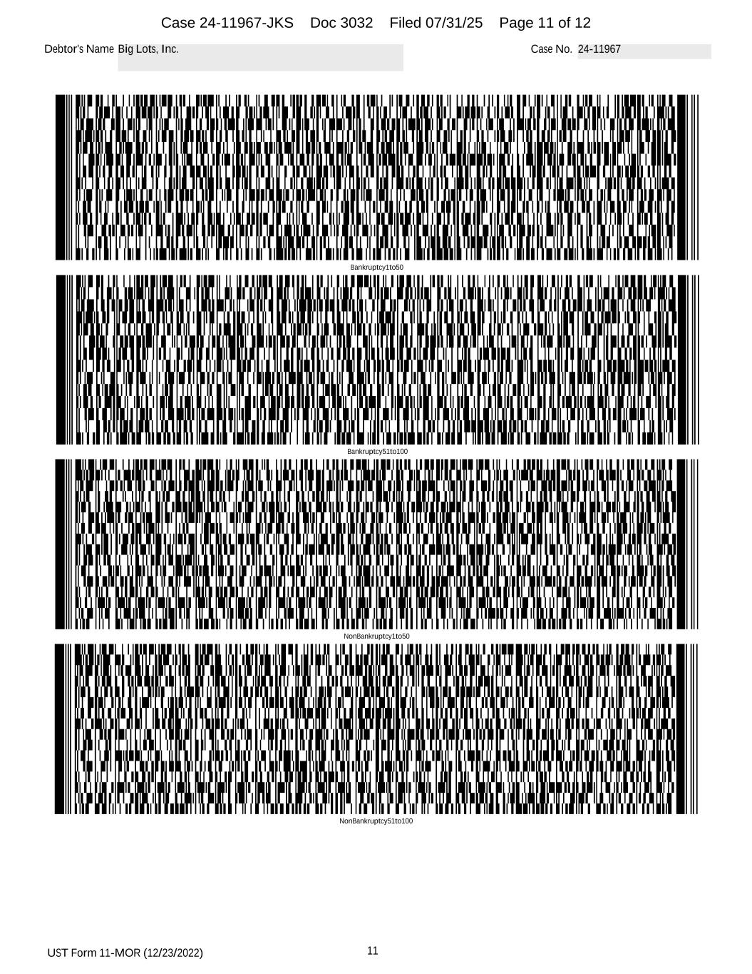 UST Form 11-MOR (12/23/2022) 11 Debtor's Name Big Lots, Inc. Case No. 24-11967 Bankruptcy51to100 NonBankruptcy1to50 NonBankruptcy51to100 Bankruptcy1to50 Case 24-11967-JKS Doc 3032 Filed 07/31/25 Page 11 of 12