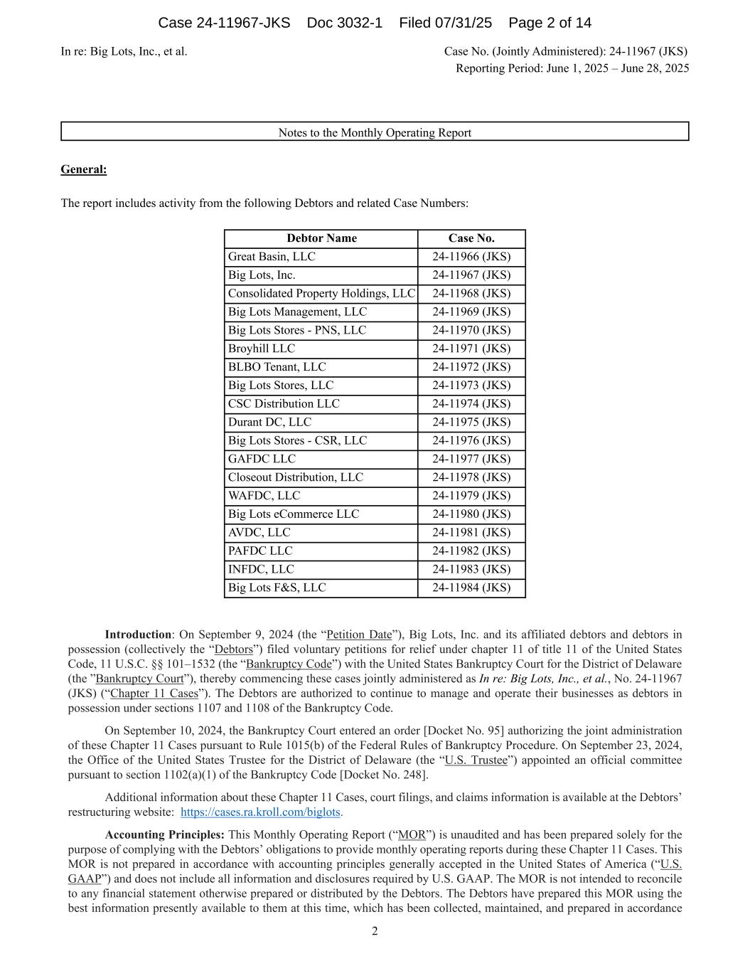 In re: Big Lots, Inc., et al. Case No. (Jointly Administered): 24-11967 (JKS) Reporting Period: June 1, 2025 – June 28, 2025 2 Notes to the Monthly Operating Report General: The report includes activity from the following Debtors and related Case Numbers: Debtor Name Case No. Great Basin, LLC 24-11966 (JKS) Big Lots, Inc. 24-11967 (JKS) Consolidated Property Holdings, LLC 24-11968 (JKS) Big Lots Management, LLC 24-11969 (JKS) Big Lots Stores - PNS, LLC 24-11970 (JKS) Broyhill LLC 24-11971 (JKS) BLBO Tenant, LLC 24-11972 (JKS) Big Lots Stores, LLC 24-11973 (JKS) CSC Distribution LLC 24-11974 (JKS) Durant DC, LLC 24-11975 (JKS) Big Lots Stores - CSR, LLC 24-11976 (JKS) GAFDC LLC 24-11977 (JKS) Closeout Distribution, LLC 24-11978 (JKS) WAFDC, LLC 24-11979 (JKS) Big Lots eCommerce LLC 24-11980 (JKS) AVDC, LLC 24-11981 (JKS) PAFDC LLC 24-11982 (JKS) INFDC, LLC 24-11983 (JKS) Big Lots F&S, LLC 24-11984 (JKS) Introduction: On September 9, 2024 (the “Petition Date”), Big Lots, Inc. and its affiliated debtors and debtors in possession (collectively the “Debtors”) filed voluntary petitions for relief under chapter 11 of title 11 of the United States Code, 11 U.S.C. §§ 101–1532 (the “Bankruptcy Code”) with the United States Bankruptcy Court for the District of Delaware (the ”Bankruptcy Court”), thereby commencing these cases jointly administered as In re: Big Lots, Inc., et al., No. 24-11967 (JKS) (“Chapter 11 Cases”). The Debtors are authorized to continue to manage and operate their businesses as debtors in possession under sections 1107 and 1108 of the Bankruptcy Code. On September 10, 2024, the Bankruptcy Court entered an order [Docket No. 95] authorizing the joint administration of these Chapter 11 Cases pursuant to Rule 1015(b) of the Federal Rules of Bankruptcy Procedure. On September 23, 2024, the Office of the United States Trustee for the District of Delaware (the “U.S. Trustee”) appointed an official committee pursuant to section 1102(a)(1) of the Bankruptcy Code [Docket No. 248]. Additional information about these Chapter 11 Cases, court filings, and claims information is available at the Debtors’ restructuring website: https://cases.ra.kroll.com/biglots. Accounting Principles: This Monthly Operating Report (“MOR”) is unaudited and has been prepared solely for the purpose of complying with the Debtors’ obligations to provide monthly operating reports during these Chapter 11 Cases. This MOR is not prepared in accordance with accounting principles generally accepted in the United States of America (“U.S. GAAP”) and does not include all information and disclosures required by U.S. GAAP. The MOR is not intended to reconcile to any financial statement otherwise prepared or distributed by the Debtors. The Debtors have prepared this MOR using the best information presently available to them at this time, which has been collected, maintained, and prepared in accordance Case 24-11967-JKS Doc 3032-1 Filed 07/31/25 Page 2 of 14