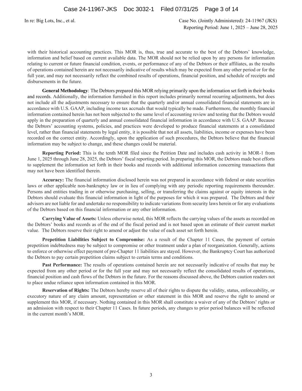 In re: Big Lots, Inc., et al. Case No. (Jointly Administered): 24-11967 (JKS) Reporting Period: June 1, 2025 – June 28, 2025 3 with their historical accounting practices. This MOR is, thus, true and accurate to the best of the Debtors’ knowledge, information and belief based on current available data. The MOR should not be relied upon by any persons for information relating to current or future financial condition, events, or performance of any of the Debtors or their affiliates, as the results of operations contained herein are not necessarily indicative of results which may be expected from any other period or for the full year, and may not necessarily reflect the combined results of operations, financial position, and schedule of receipts and disbursements in the future. General Methodology: The Debtors prepared this MOR relying primarily upon the information set forth in their books and records. Additionally, the information furnished in this report includes primarily normal recurring adjustments, but does not include all the adjustments necessary to ensure that the quarterly and/or annual consolidated financial statements are in accordance with U.S. GAAP, including income tax accruals that would typically be made. Furthermore, the monthly financial information contained herein has not been subjected to the same level of accounting review and testing that the Debtors would apply in the preparation of quarterly and annual consolidated financial information in accordance with U.S. GAAP. Because the Debtors’ accounting systems, policies, and practices were developed to produce financial statements at a consolidated level, rather than financial statements by legal entity, it is possible that not all assets, liabilities, income or expenses have been recorded on the correct entity. Accordingly, upon the application of such procedures, the Debtors believe that the financial information may be subject to change, and these changes could be material. Reporting Period: This is the tenth MOR filed since the Petition Date and includes cash activity in MOR-1 from June 1, 2025 through June 28, 2025, the Debtors’ fiscal reporting period. In preparing this MOR, the Debtors made best efforts to supplement the information set forth in their books and records with additional information concerning transactions that may not have been identified therein. Accuracy: The financial information disclosed herein was not prepared in accordance with federal or state securities laws or other applicable non-bankruptcy law or in lieu of complying with any periodic reporting requirements thereunder. Persons and entities trading in or otherwise purchasing, selling, or transferring the claims against or equity interests in the Debtors should evaluate this financial information in light of the purposes for which it was prepared. The Debtors and their advisors are not liable for and undertake no responsibility to indicate variations from security laws herein or for any evaluations of the Debtors based on this financial information or any other information. Carrying Value of Assets: Unless otherwise noted, this MOR reflects the carrying values of the assets as recorded on the Debtors’ books and records as of the end of the fiscal period and is not based upon an estimate of their current market value. The Debtors reserve their right to amend or adjust the value of each asset set forth herein. Prepetition Liabilities Subject to Compromise: As a result of the Chapter 11 Cases, the payment of certain prepetition indebtedness may be subject to compromise or other treatment under a plan of reorganization. Generally, actions to enforce or otherwise effect payment of pre-Chapter 11 liabilities are stayed. However, the Bankruptcy Court has authorized the Debtors to pay certain prepetition claims subject to certain terms and conditions. Past Performance: The results of operations contained herein are not necessarily indicative of results that may be expected from any other period or for the full year and may not necessarily reflect the consolidated results of operations, financial position and cash flows of the Debtors in the future. For the reasons discussed above, the Debtors caution readers not to place undue reliance upon information contained in this MOR. Reservation of Rights: The Debtors hereby reserve all of their rights to dispute the validity, status, enforceability, or executory nature of any claim amount, representation or other statement in this MOR and reserve the right to amend or supplement this MOR, if necessary. Nothing contained in this MOR shall constitute a waiver of any of the Debtors’ rights or an admission with respect to their Chapter 11 Cases. In future periods, any changes to prior period balances will be reflected in the current month’s MOR. Case 24-11967-JKS Doc 3032-1 Filed 07/31/25 Page 3 of 14