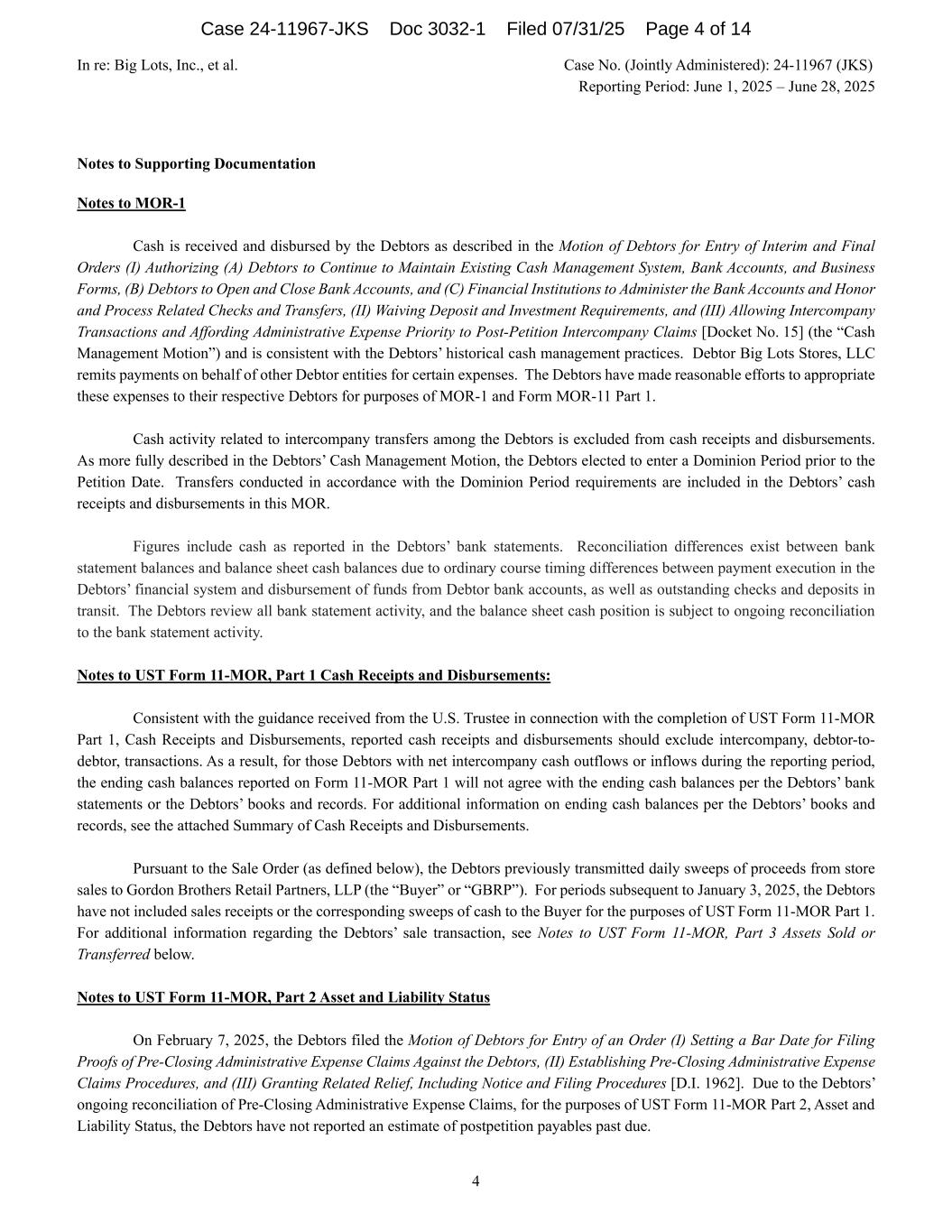 In re: Big Lots, Inc., et al. Case No. (Jointly Administered): 24-11967 (JKS) Reporting Period: June 1, 2025 – June 28, 2025 4 Notes to Supporting Documentation Notes to MOR-1 Cash is received and disbursed by the Debtors as described in the Motion of Debtors for Entry of Interim and Final Orders (I) Authorizing (A) Debtors to Continue to Maintain Existing Cash Management System, Bank Accounts, and Business Forms, (B) Debtors to Open and Close Bank Accounts, and (C) Financial Institutions to Administer the Bank Accounts and Honor and Process Related Checks and Transfers, (II) Waiving Deposit and Investment Requirements, and (III) Allowing Intercompany Transactions and Affording Administrative Expense Priority to Post-Petition Intercompany Claims [Docket No. 15] (the “Cash Management Motion”) and is consistent with the Debtors’ historical cash management practices. Debtor Big Lots Stores, LLC remits payments on behalf of other Debtor entities for certain expenses. The Debtors have made reasonable efforts to appropriate these expenses to their respective Debtors for purposes of MOR-1 and Form MOR-11 Part 1. Cash activity related to intercompany transfers among the Debtors is excluded from cash receipts and disbursements. As more fully described in the Debtors’ Cash Management Motion, the Debtors elected to enter a Dominion Period prior to the Petition Date. Transfers conducted in accordance with the Dominion Period requirements are included in the Debtors’ cash receipts and disbursements in this MOR. Figures include cash as reported in the Debtors’ bank statements. Reconciliation differences exist between bank statement balances and balance sheet cash balances due to ordinary course timing differences between payment execution in the Debtors’ financial system and disbursement of funds from Debtor bank accounts, as well as outstanding checks and deposits in transit. The Debtors review all bank statement activity, and the balance sheet cash position is subject to ongoing reconciliation to the bank statement activity. Notes to UST Form 11-MOR, Part 1 Cash Receipts and Disbursements: Consistent with the guidance received from the U.S. Trustee in connection with the completion of UST Form 11-MOR Part 1, Cash Receipts and Disbursements, reported cash receipts and disbursements should exclude intercompany, debtor-to- debtor, transactions. As a result, for those Debtors with net intercompany cash outflows or inflows during the reporting period, the ending cash balances reported on Form 11-MOR Part 1 will not agree with the ending cash balances per the Debtors’ bank statements or the Debtors’ books and records. For additional information on ending cash balances per the Debtors’ books and records, see the attached Summary of Cash Receipts and Disbursements. Pursuant to the Sale Order (as defined below), the Debtors previously transmitted daily sweeps of proceeds from store sales to Gordon Brothers Retail Partners, LLP (the “Buyer” or “GBRP”). For periods subsequent to January 3, 2025, the Debtors have not included sales receipts or the corresponding sweeps of cash to the Buyer for the purposes of UST Form 11-MOR Part 1. For additional information regarding the Debtors’ sale transaction, see Notes to UST Form 11-MOR, Part 3 Assets Sold or Transferred below. Notes to UST Form 11-MOR, Part 2 Asset and Liability Status On February 7, 2025, the Debtors filed the Motion of Debtors for Entry of an Order (I) Setting a Bar Date for Filing Proofs of Pre-Closing Administrative Expense Claims Against the Debtors, (II) Establishing Pre-Closing Administrative Expense Claims Procedures, and (III) Granting Related Relief, Including Notice and Filing Procedures [D.I. 1962]. Due to the Debtors’ ongoing reconciliation of Pre-Closing Administrative Expense Claims, for the purposes of UST Form 11-MOR Part 2, Asset and Liability Status, the Debtors have not reported an estimate of postpetition payables past due. Case 24-11967-JKS Doc 3032-1 Filed 07/31/25 Page 4 of 14